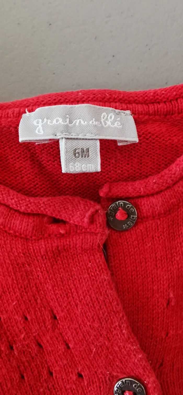 Gilet rouge (beaucoup de luminosité sur la première photo, se fier à la seconde pour la couleur) En très bon état. 6 mois. Grain de blé