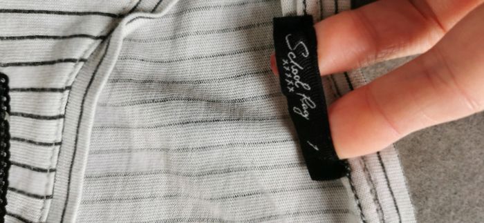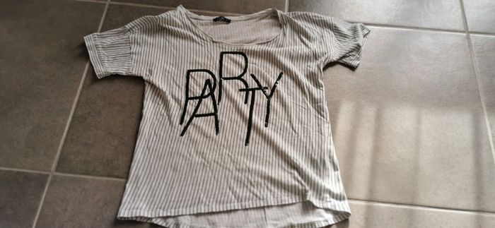 Tee-shirt manches courtes, rayé noir et blanc. Inscription Party en sequins noir. Taille S. Marque school Ray.