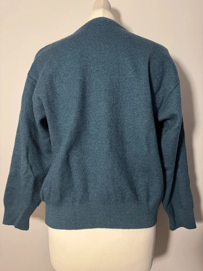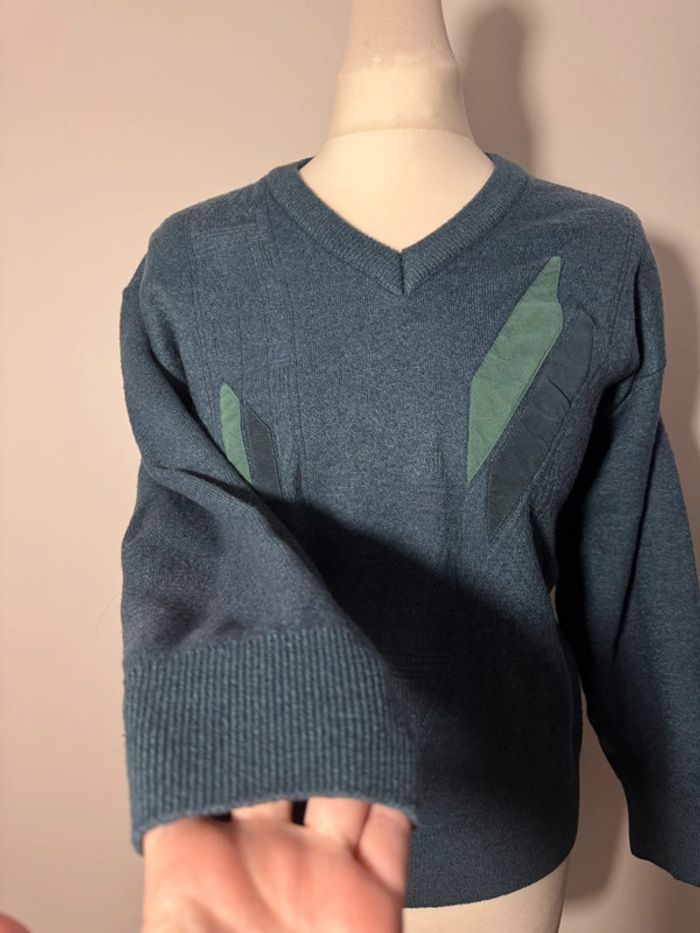 Pull bleu rétro en laine vintage – Détails géométriques verts et coupe ample - photo numéro 6
