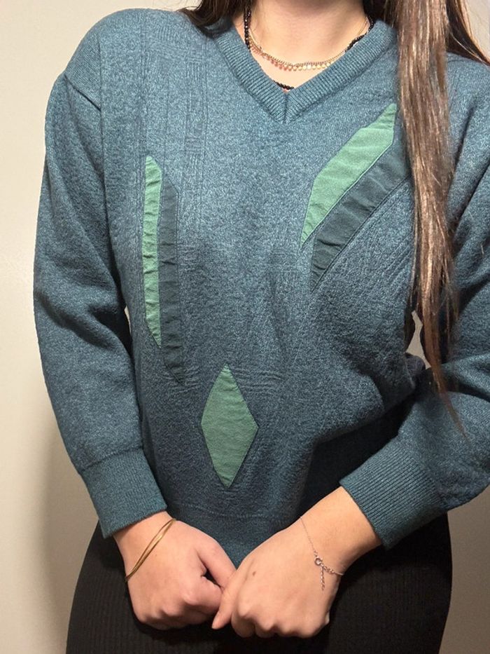 Pull bleu rétro en laine vintage – Détails géométriques verts et coupe ample