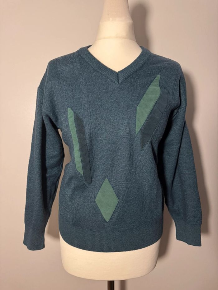 Pull bleu rétro en laine vintage – Détails géométriques verts et coupe ample - photo numéro 1
