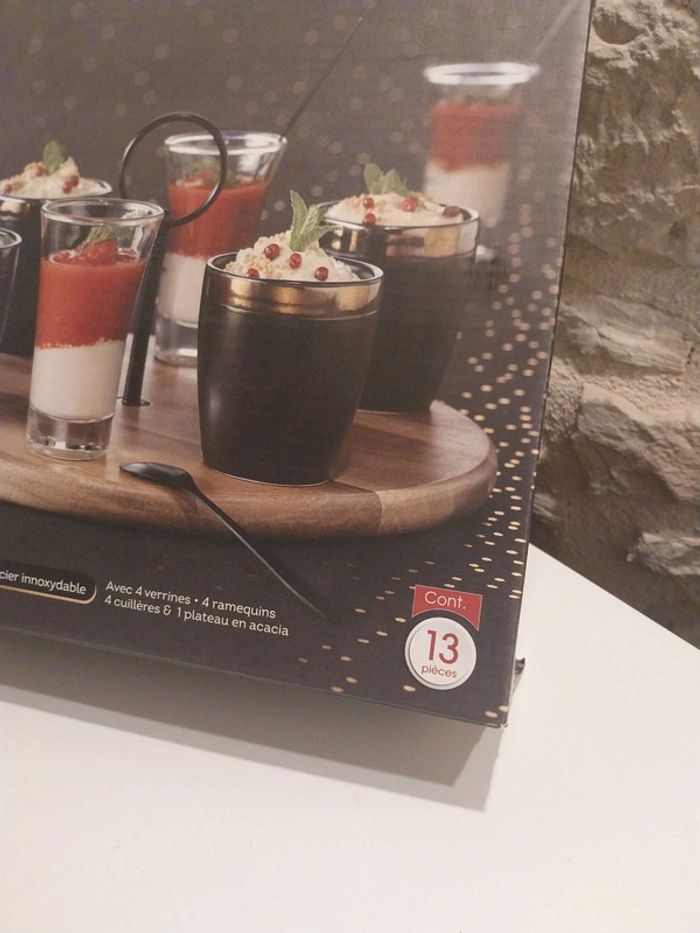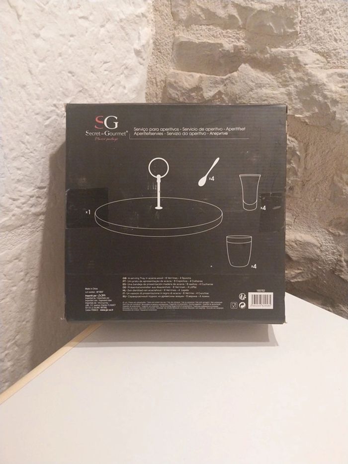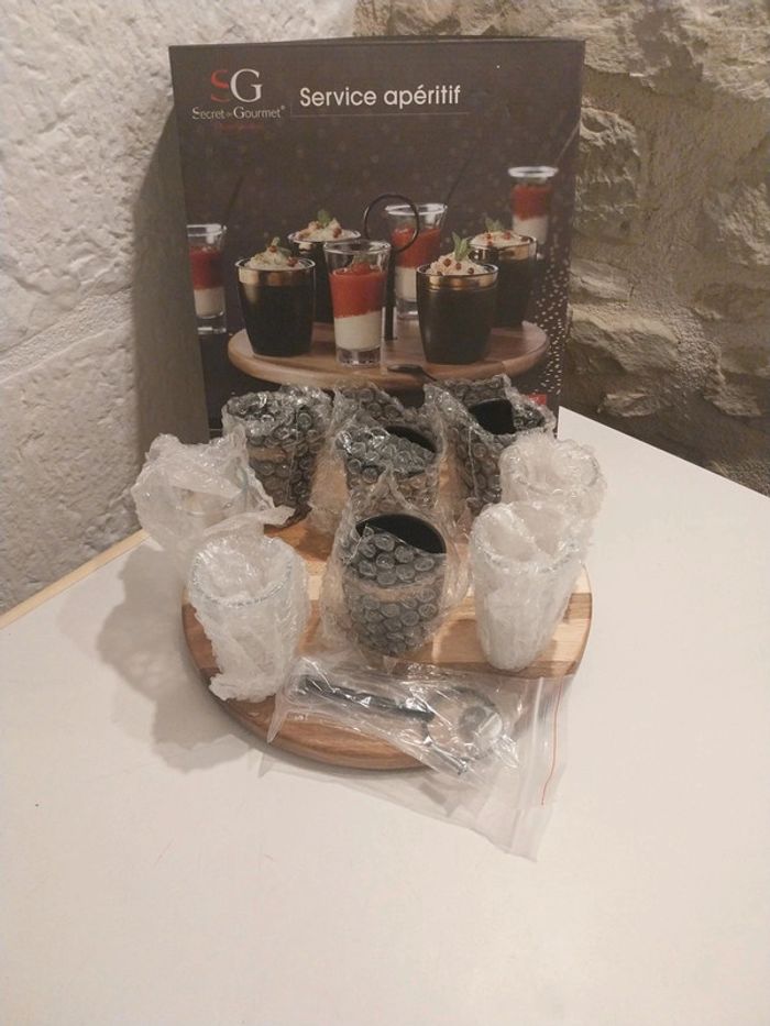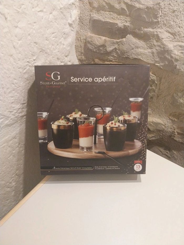 Nous mettons en vente ce magnifique service apéritif secret de gourmet. Neuf jamais utilisé, 13 pièces Plateau acacia, céramique, verre et acier inoxydable. Un service apéritif qui ne pourra que ravir vos invités.