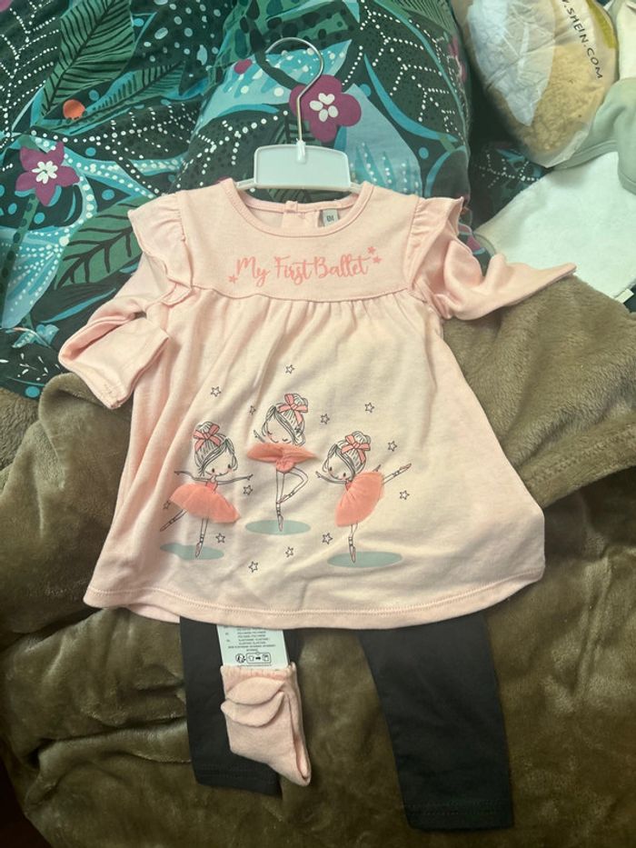 À vendre, jolie tenue pour bébé fille, en taille six mois, composé d’une tunique d’un leggins et d’une paire de chaussettes