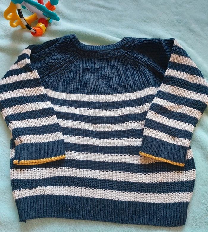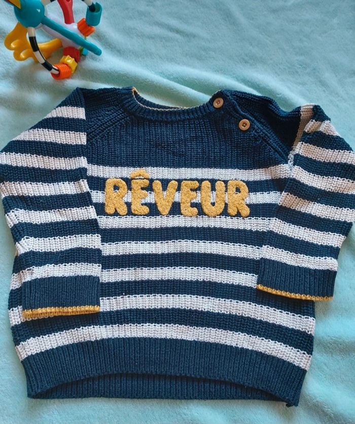 Pull tape a l'œil taille 18 mois. Inscription un peu boulochée.