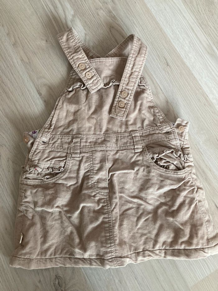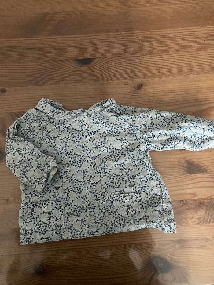 robe salopette en velours beige obaibi avec chemise à petites fleurs bleues. très bon état. taille 6 mois