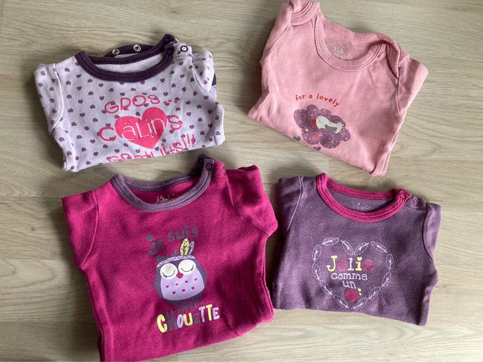 4 bodies. taille 3 mois. bodies chouette taille 6 mois mais très petit
