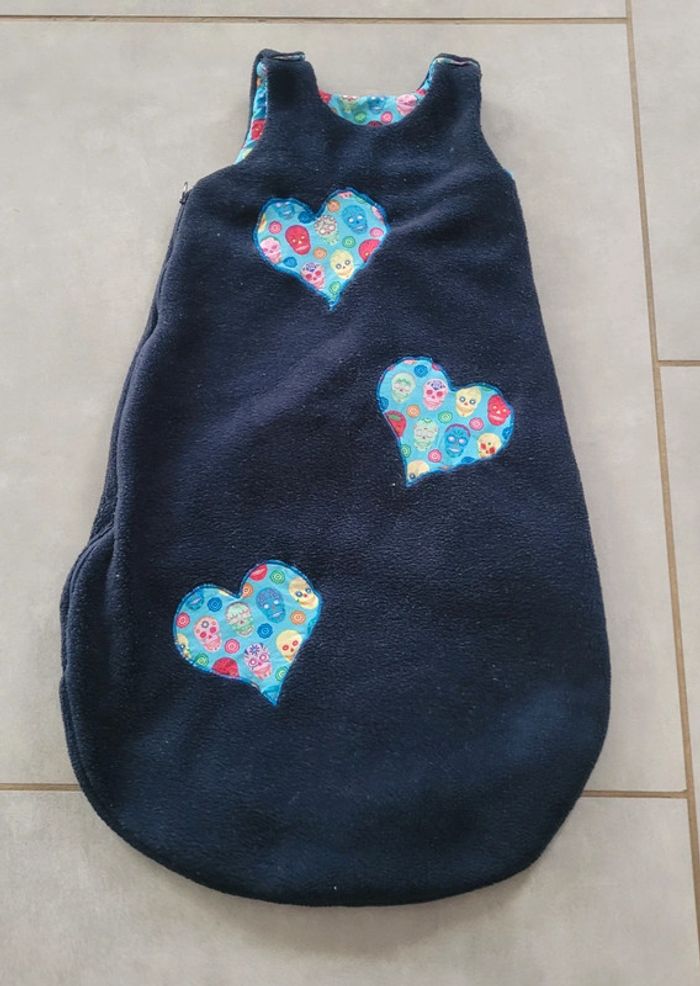 Gigoteuse épaisse, dans les tons bleus, polaire de couleur marine, taille 0-6 mois, en très bon état. Article lavé pour la vente.