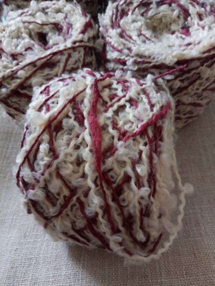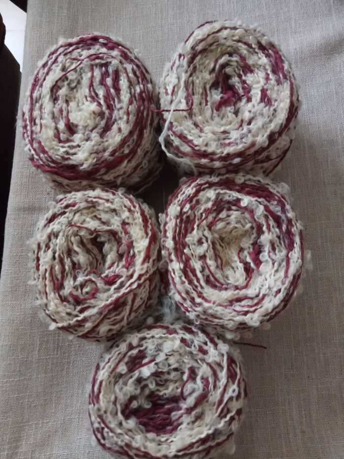 Lot de 5 Pelotes Fantaisies (340g) Couleur: Écru et Bordeaux 2 fils fantaisies Au total 340g Pelotes en parfait état