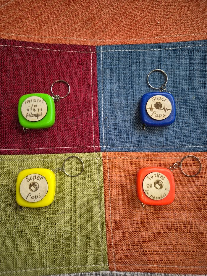 Metre personnalisé petanque dimension 1 mètre. Mode porte cle personnalisé sur la pastille en bois de peuplier puis coller