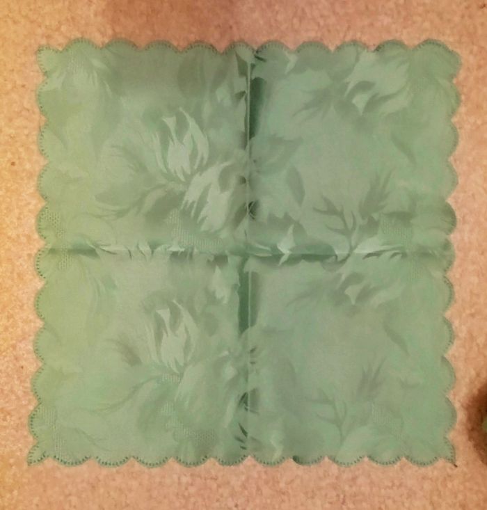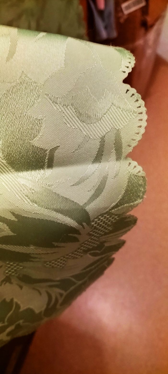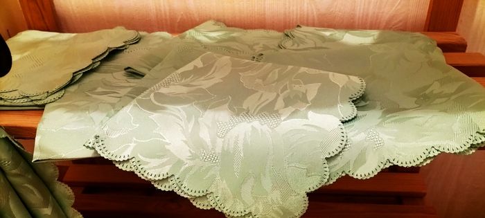 Lot nappe ovale Longueur 2m60 Et 12 serviettes Le tout excellent état Couleur vert Motifs fleurs en fond Le lot a servi une soirée 25€
