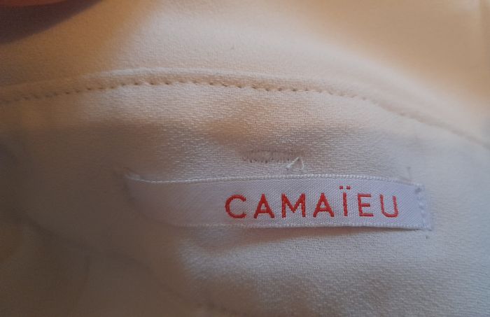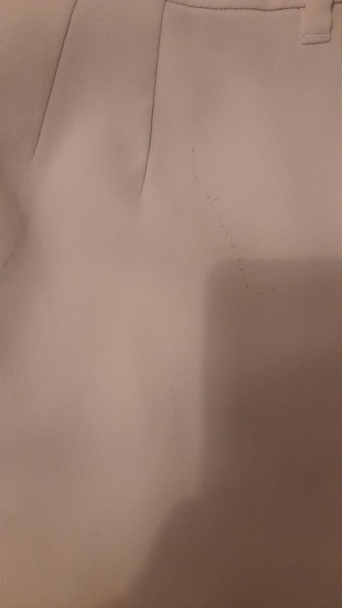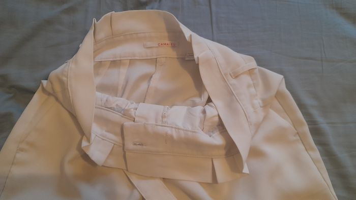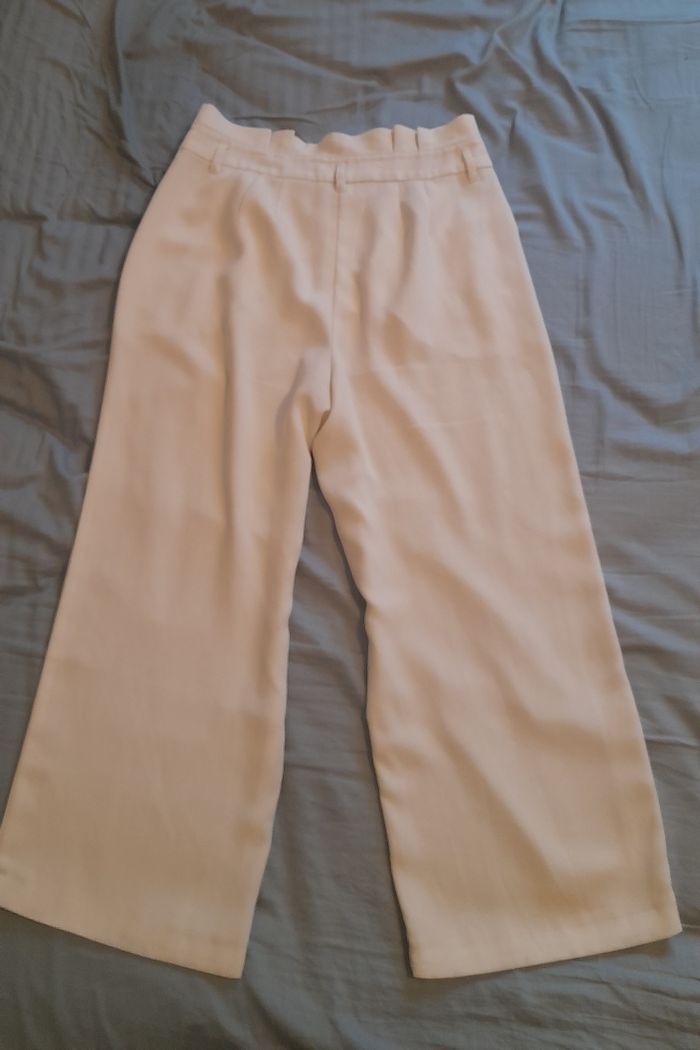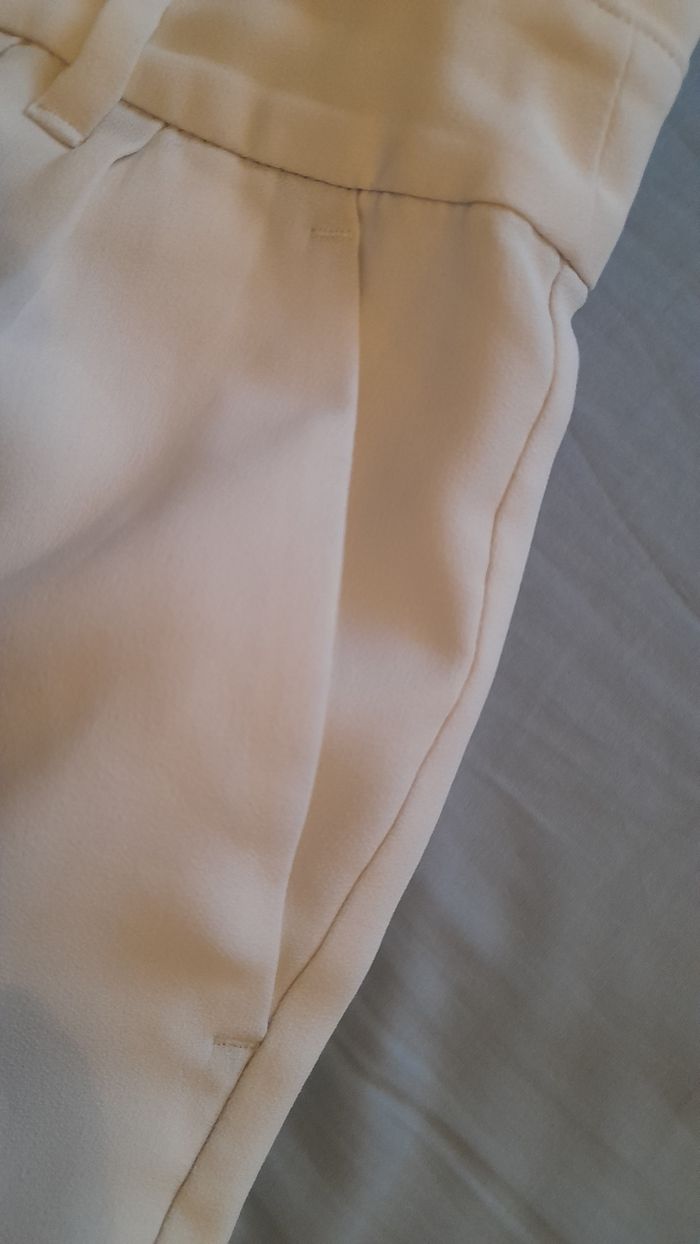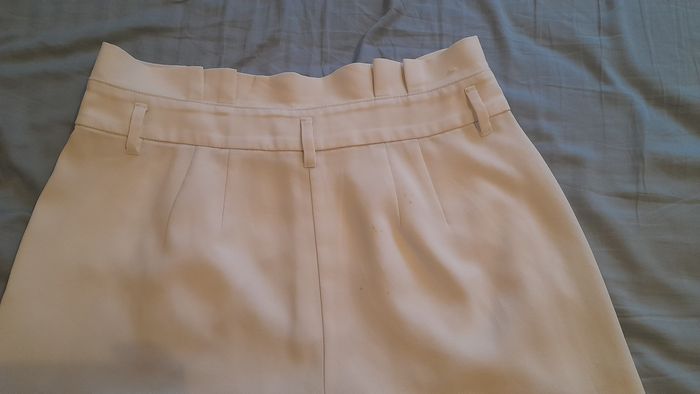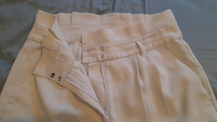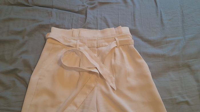 Pantalon léger idéal pour le printemps. Taille haute Fermeture éclair, boutons et accroches. Ourlets intérieur Passant ceinture et ceinture en tissus. 2 poches. Pantalon court sur cheville. Couleur blanc Légère tâche sur une fesse
