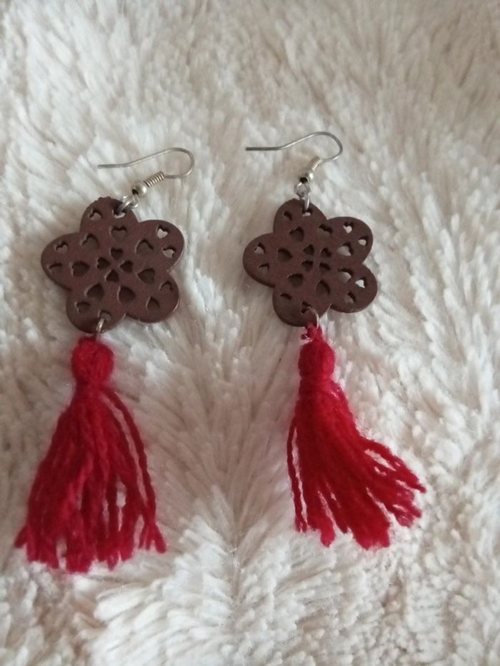 Paire de Boucles en bois et pompon long Petit detail en bas de la fleur , voire photo #pompones #pompon #lot #boucles #bois #wood #madera #ligero #aretes #pendientes #pendant #fleur #flower #chic #elegant #hippie #boheme #boho #bijou #joyeria #fantaisie #original #dafnezado #dafnezfemme #dafnezbijou #dafnezechange