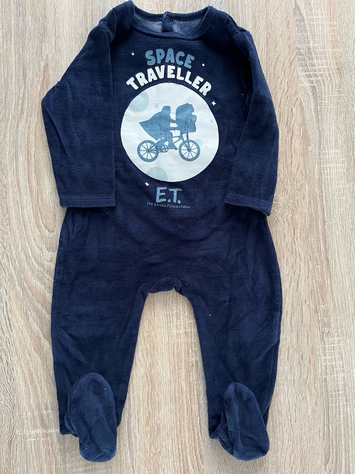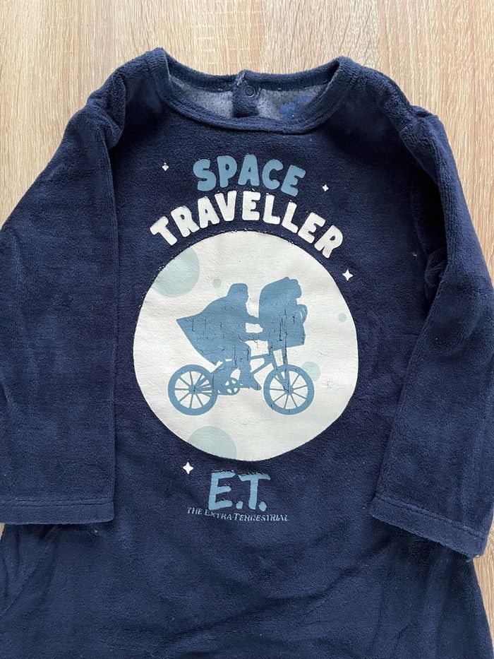 Pyjama 1 pièce velours E.T taille: 23 mois Le dessin est phosphorescent est brillé la nuit. En bon état (juste le contour d’une pression un peu arraché mais ne gêne en rien s’accroche toujours) Maison non fumeur et personne soigneuse