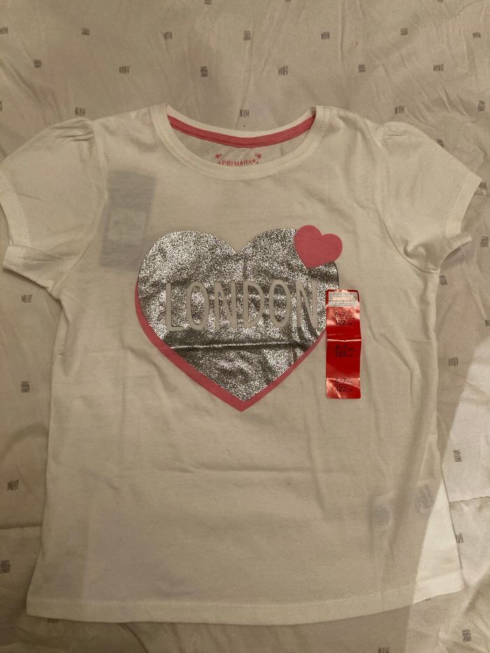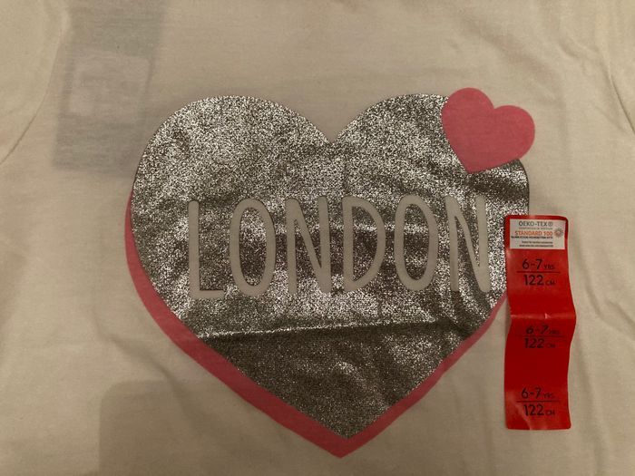 Joli tee-shirt avec un cœur argenté london Taille 6/7 ans (122 cms) Acheté à Londres en exclusivité non commercialisé en France Neuf jamais porté Non négociable Envoi rapide et soigné