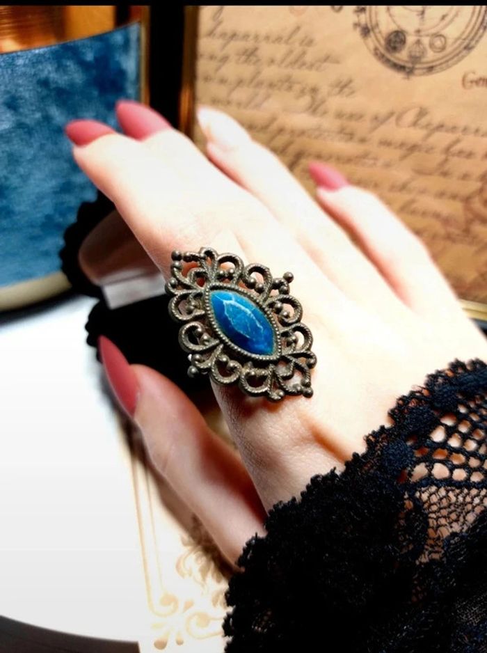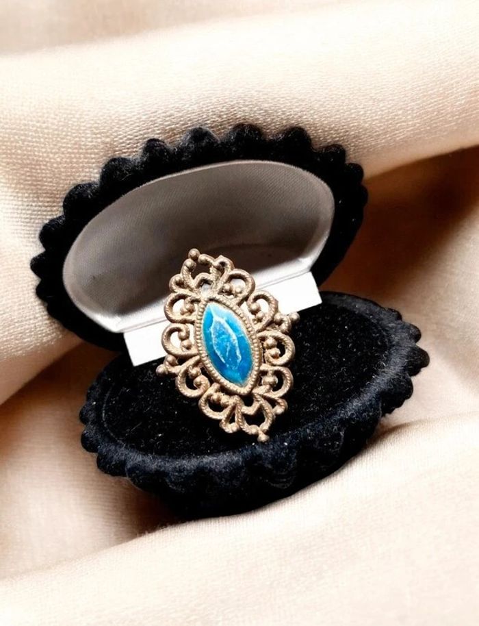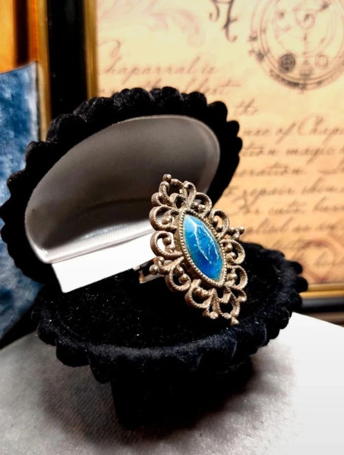 Magnifique bague ajustable, style marquise. Travail en dentelle rappelant le style victorien. Ornée d'une pierre bleu. Bon état, signe d'usures du temps donnant le charme actuel de la bague. ✨️ D'autres bijoux sont à découvrir dans mon dressing #bijouxsupernova 🌌 Je suis disponible pour d'autres renseignements / ou demandes de lot. 🌌 Les envois se font soit le jour même ou en 72h maxi ! 🌌 J'accepte les offres raisonnables et les réductions sont activées sur les lots, de plus, un petit cadeau est toujours rajouté au colis. Tags Vintage chic hippie 60's 70's 80's 90's 00's Y2k foulard soie collier bijoux fantaisie signature boucles d'oreilles bague bracelet manchette jonc parure pendentif médaille religieux ancien brocante antiguo antico juwelen bigiotteria joyería antigua antique antik vieux victorien belle époque 1920 art déco art nouveau 1930 années 50 lot gros lot lotto set carré friperie poinçon pièce rare argenté doré bronze perles strass