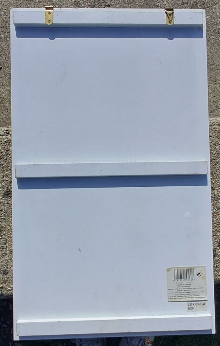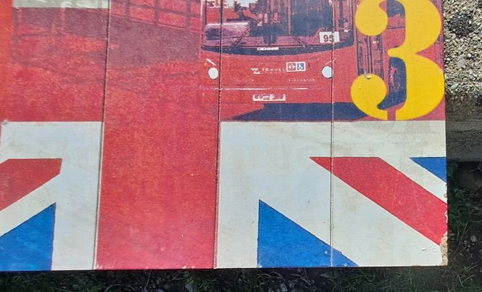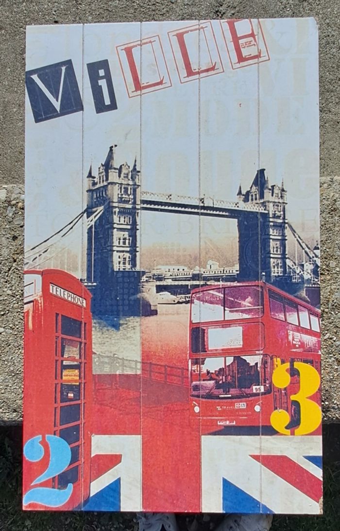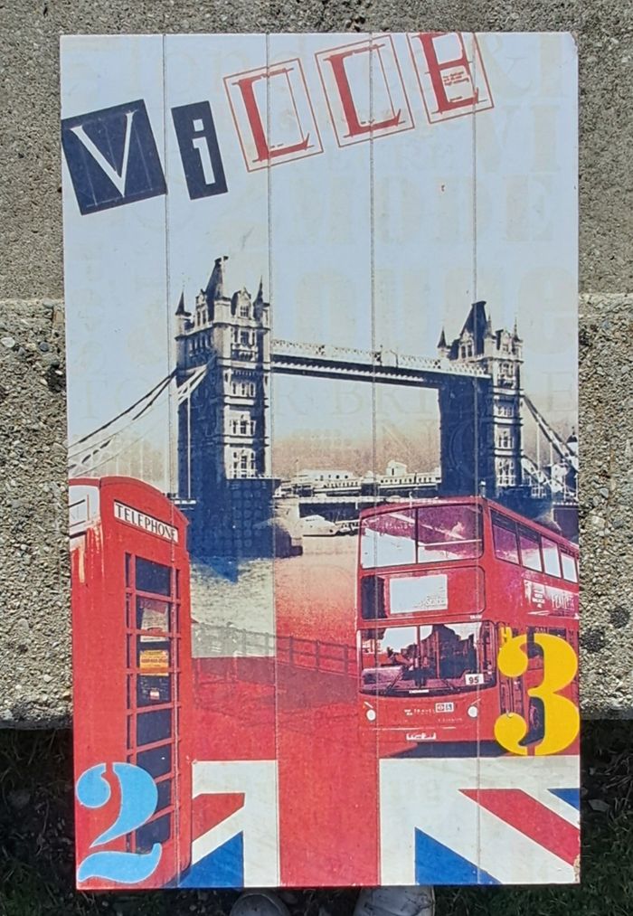 Tableau en bois sur le thème ville de Londres. Colories rouge et blanc en bon état. Légèrement abîmé sur 2 coins voir photos. Dimensions 50x30cm.