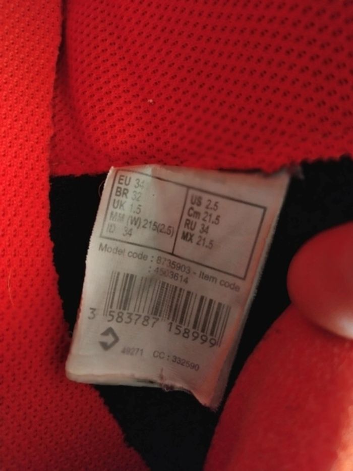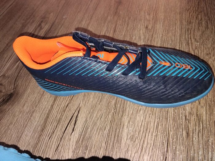 Bonjour, je vends ces baskets de futsal bleue noire et orange de la marque kipsta taille 34 en très bon état.