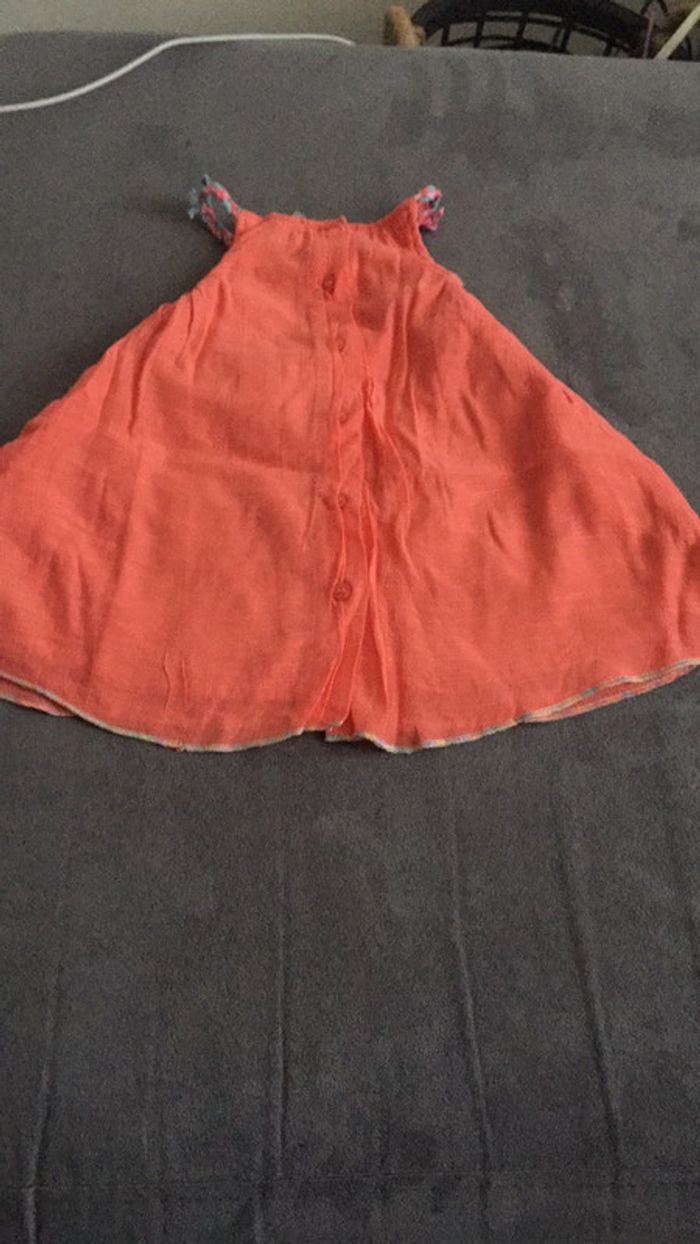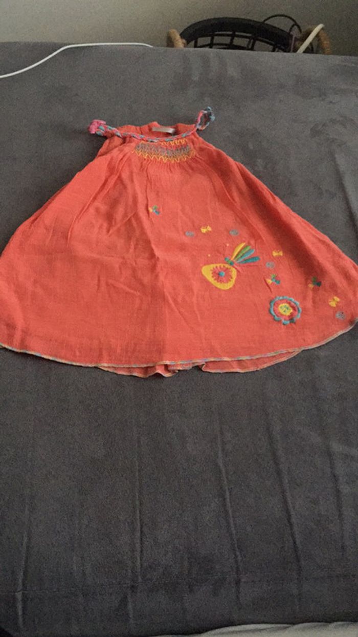 Petite robe de couleur corail/orangé avec motif sur le devant ainsi qu'au col. De marque orchestra Taille 6 mois En très bon état