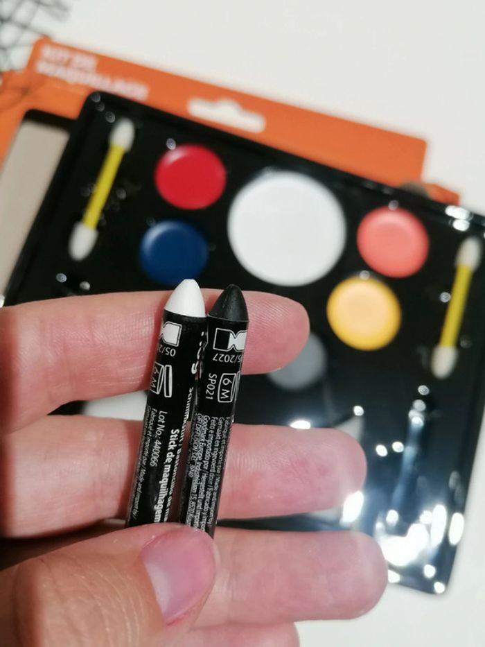 Kit de maquillage halloween 🎃🎃👻👻 Complet !! 1 crayon blanc 1 crayon noir 2 éponges 2 applicateurs 6 couleurs ( orange, jaune, noir, vert, bleu marine, rouge) Blanc pour le teint