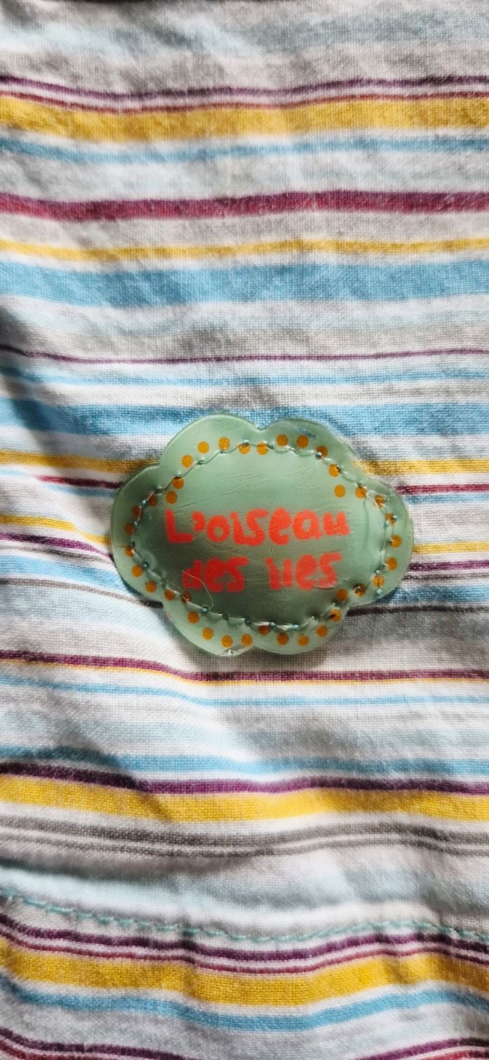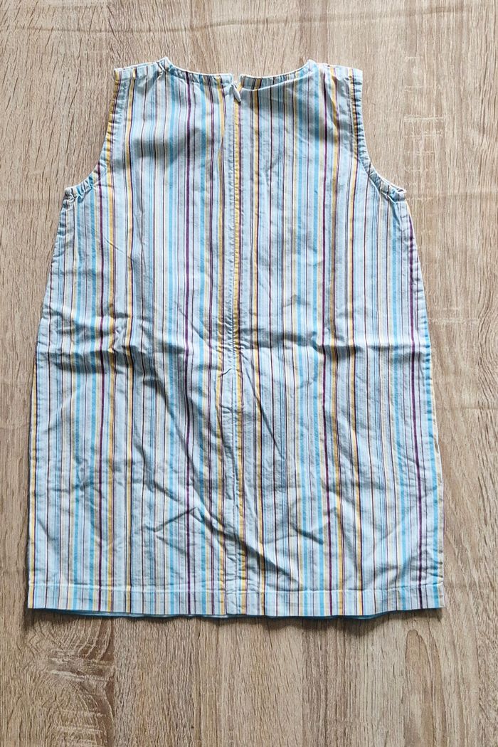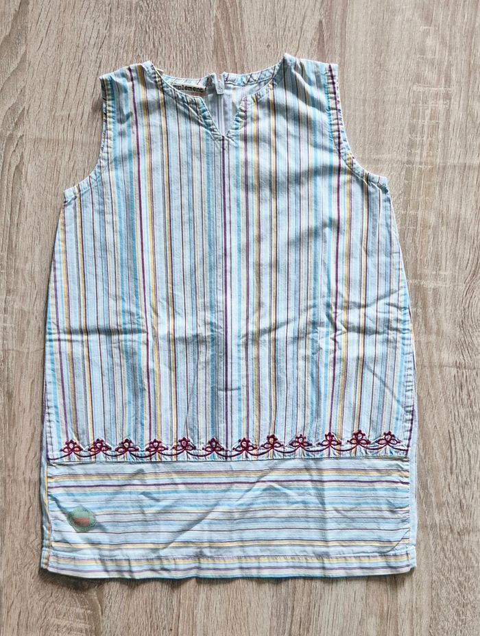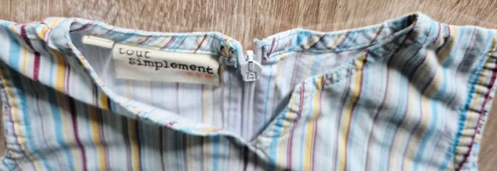 Bonjour Je vends jolie robe légère sans manches de la marque Tout Simplement. ​Motif : Rayures multicolores verticales (bleu, jaune, prune). ​Détails : Finition avec broderies sur le bas et écusson "L'oiseau des îles". ​Fermeture : Zip pratique à l'arrière. Idéale pour l'été. État : Très bon état. N'hésitez pas, j'envoie rapidement.