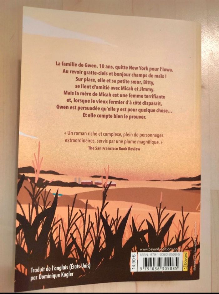 La famille de Gwen, 10 ans, quitte New York pour l’Iowa. Au revoir gratte-ciels et bonjour champs de maïs ! Sur place, elle et sa petite soeur, Bitty, se lient d’amitié avec Micah et Jimmy. Mais la mère de Micah est une femme terrifiante et, lorsque le vieux fermier d’à côté disparaît, Gwen est persuadée qu’elle y est pour quelque chose… Et elle compte bien le prouver. Excellent état, comme neuf