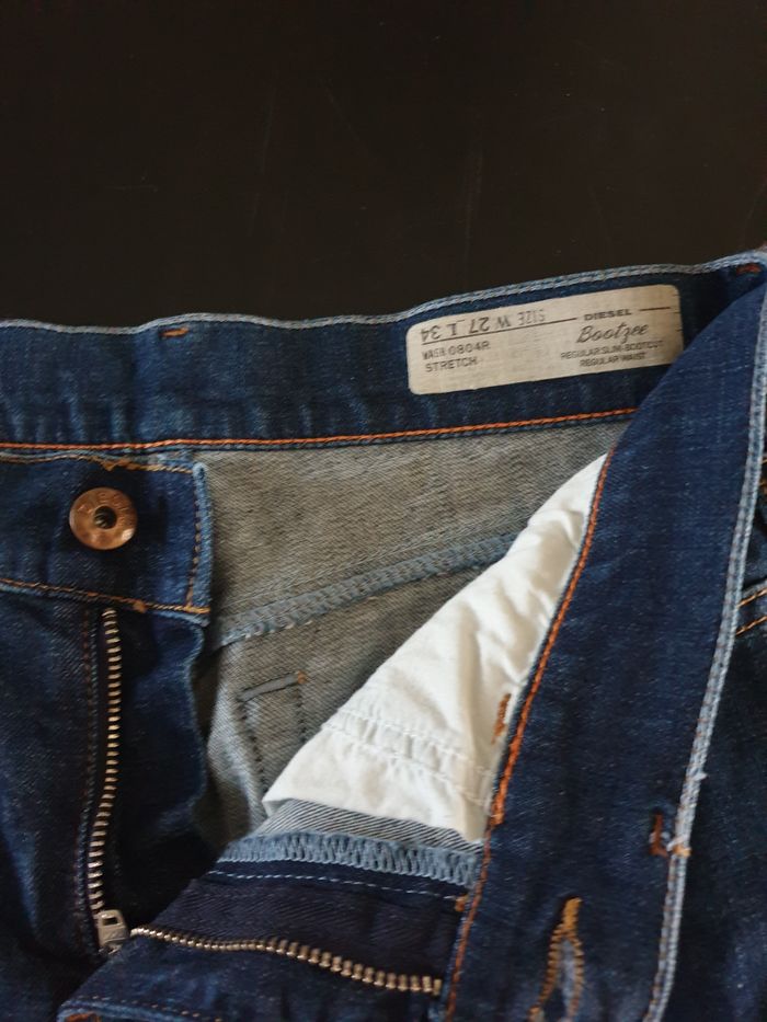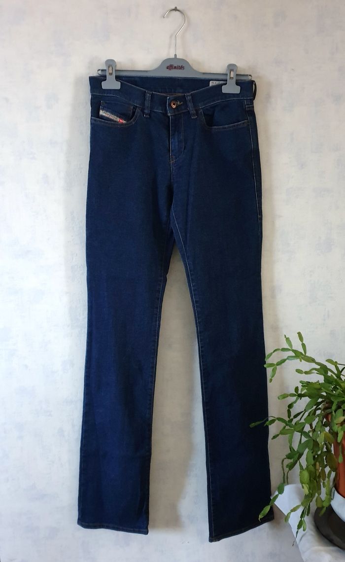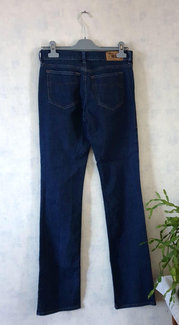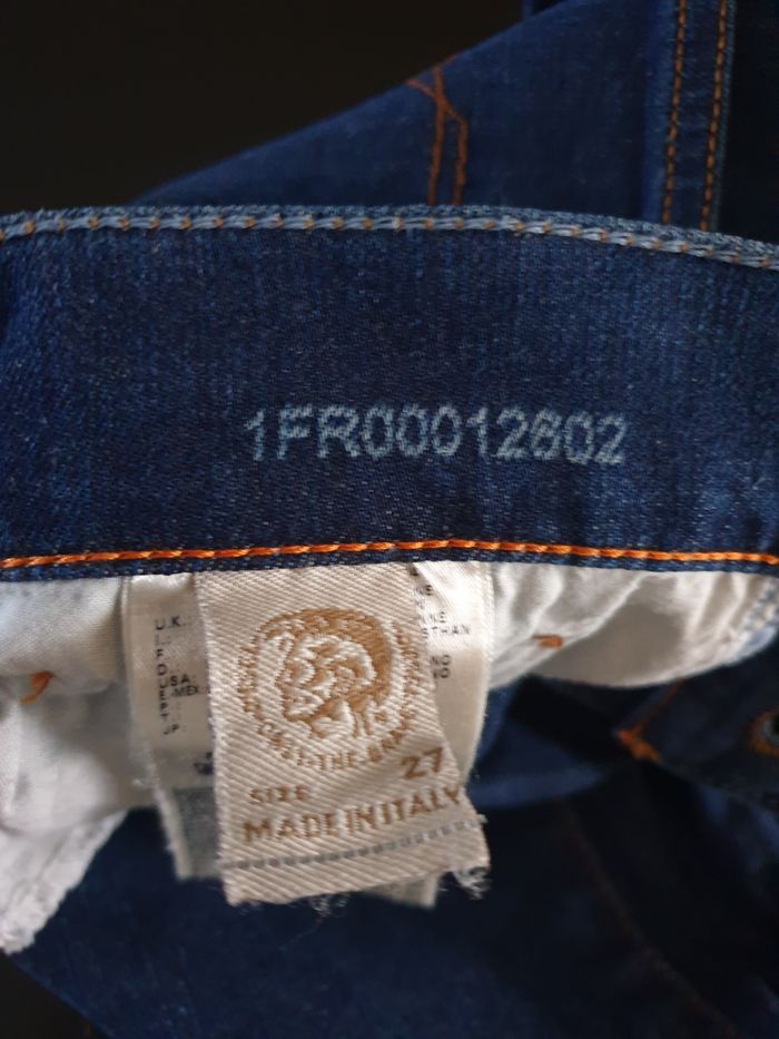 Jean regular slim, bleu, en très bon état. 2 poches avant + 1 petite 2 poches arrières Fermeture à glissière + 1 bouton. Diesel taille W 27 – L 34 98 % coton – 2 % élasthanne Made in Italy Les mesures, prises à plat, sont données à tuitre indicatif et peuvent varier de quelques millimètres : - Largeur taille : 38 cm - Longueur : 113 cm - Longueur entrejambe : 88 cm Envoi rapide et soigné.