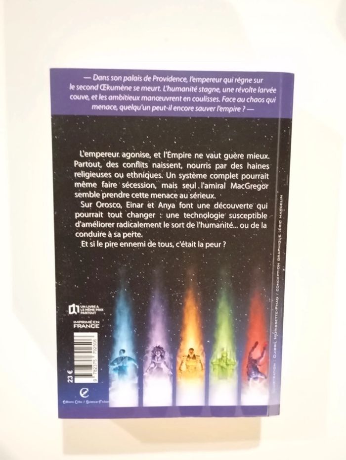 L'empereur agonise, et l'Empire ne vaut guère mieux. Partout, des conflits naissent, nourris par des haines religieuses ou ethniques. Un système complet pourrait même faire sécession, mais seul l'amiral MacGregor semble prendre cette menace au sérieux. Sur Orosco, Einar et Anya font une découverte qui pourrait tout changer : une technologie susceptible d'améliorer radicalement le sort de l'humanité... ou de la conduire à sa perte. Et si le pire ennemi de tous, c'était la peur ? Éditeur ‏ : ‎ Critic Broché : 612 pages Dimensions ‏ : ‎ 13 x 3 x 20 cm Livre en excellent état #spaceopera #johncrossford #oekumene