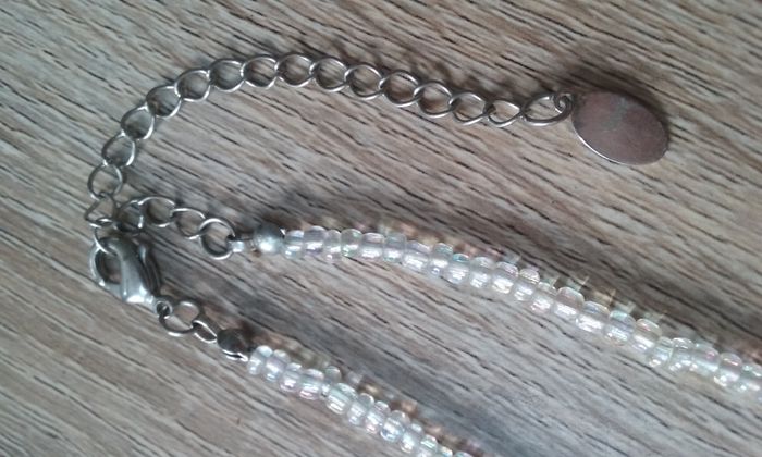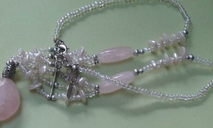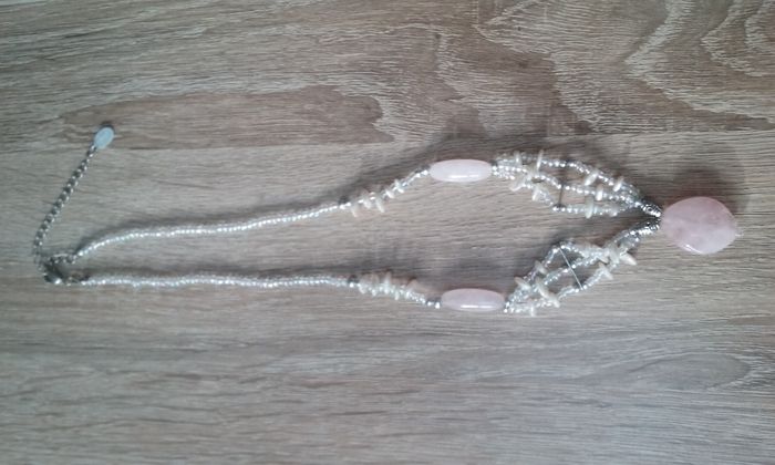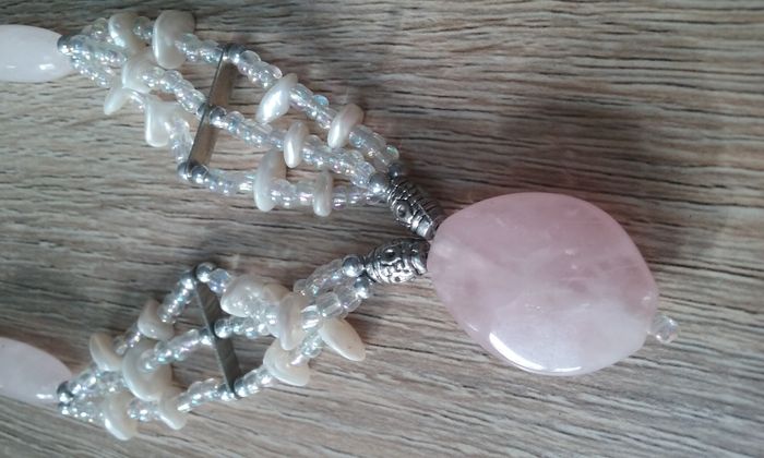 Collier en perles, quartz rose et nacre, longueur ajustable.