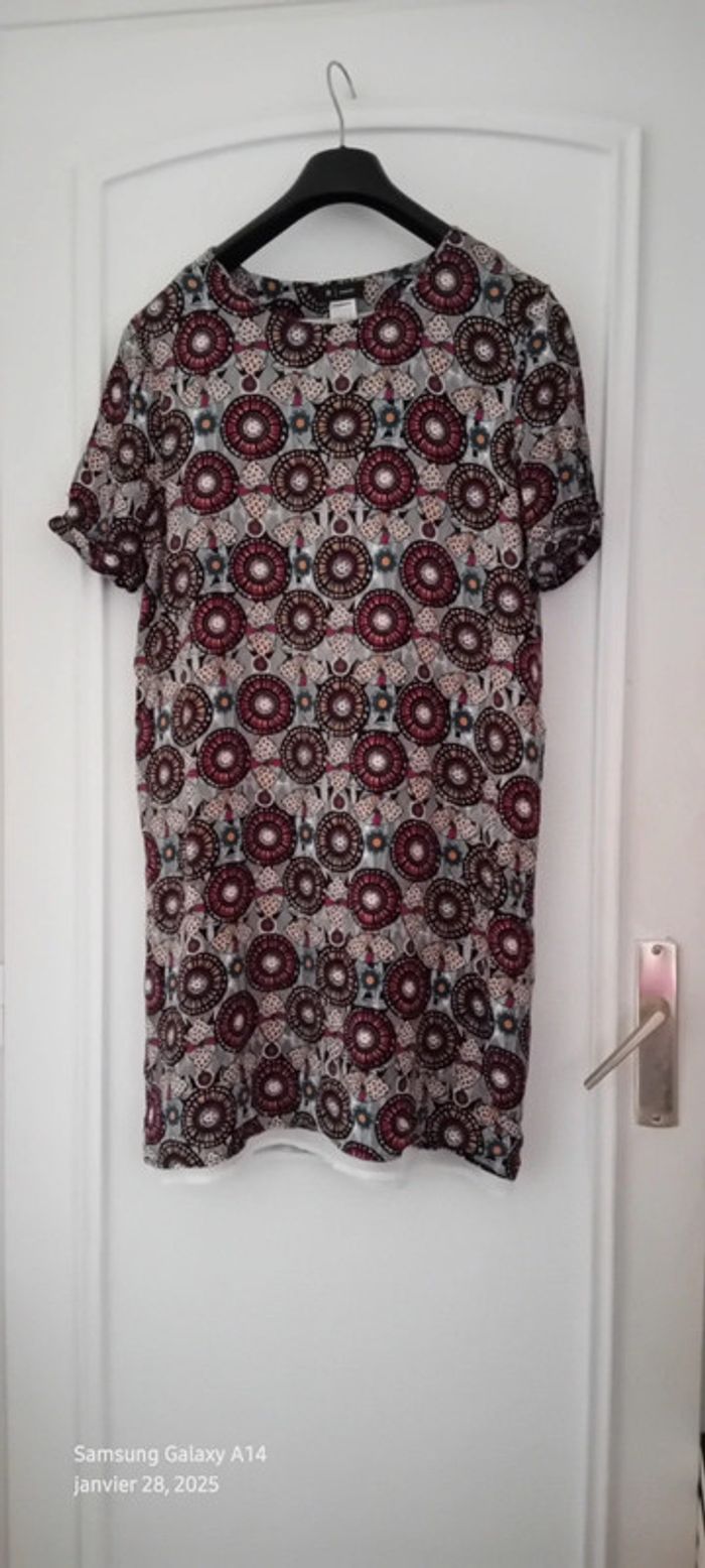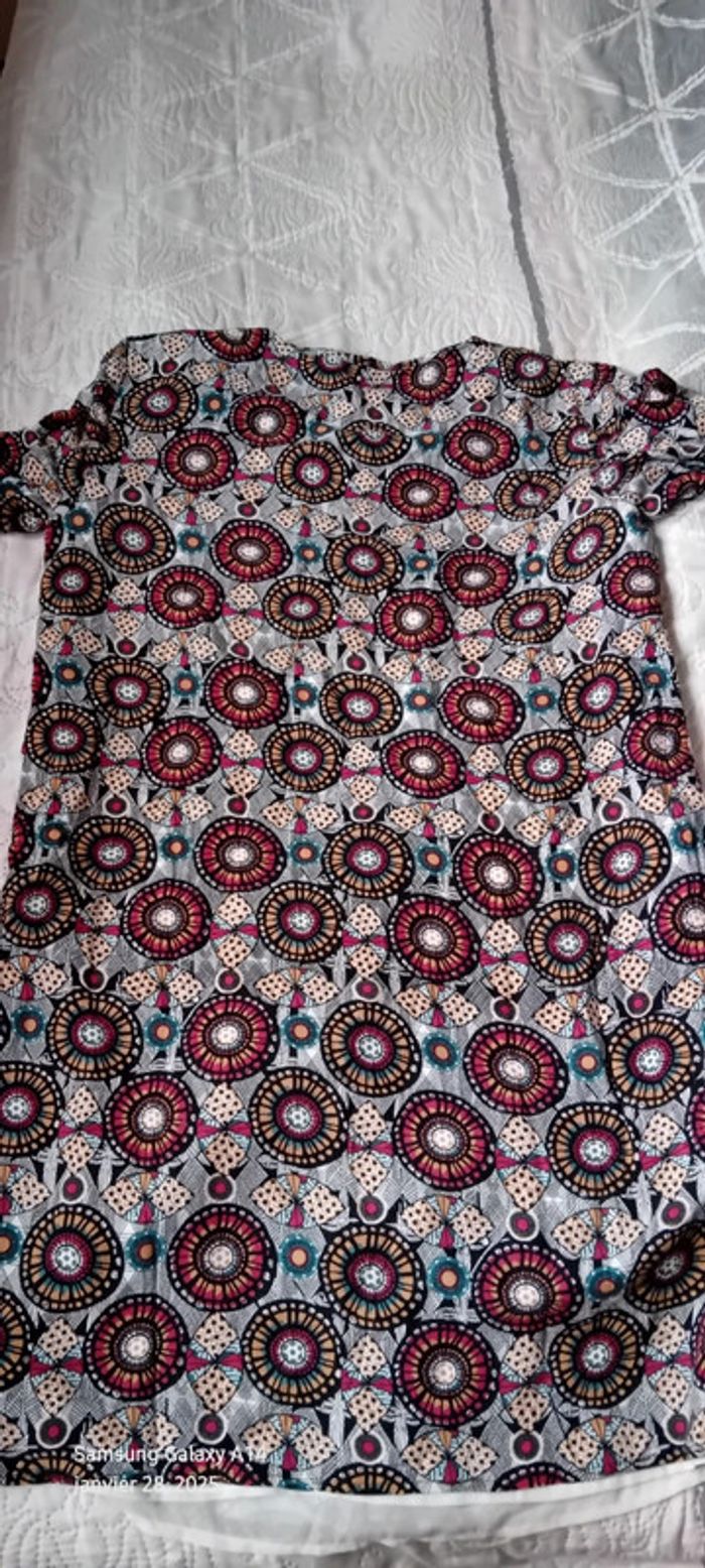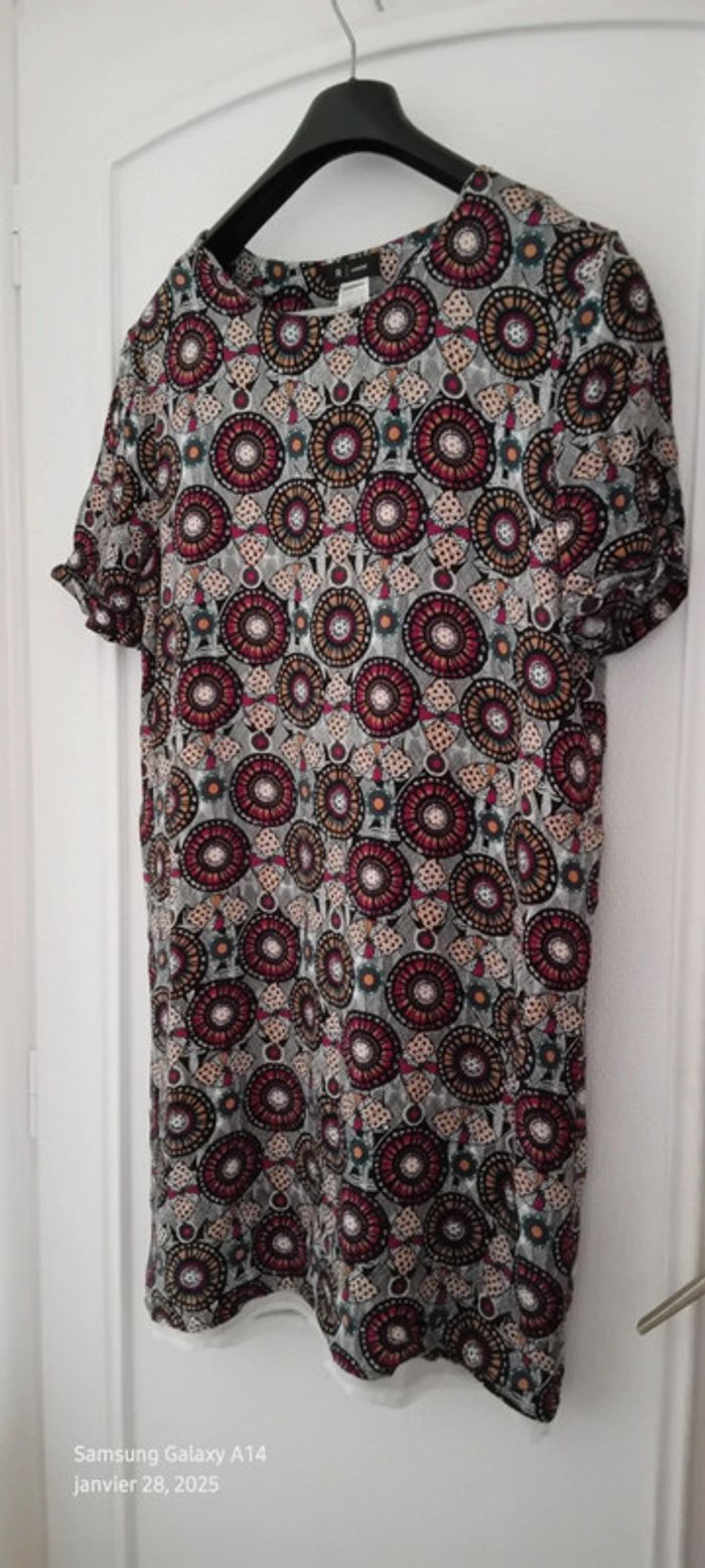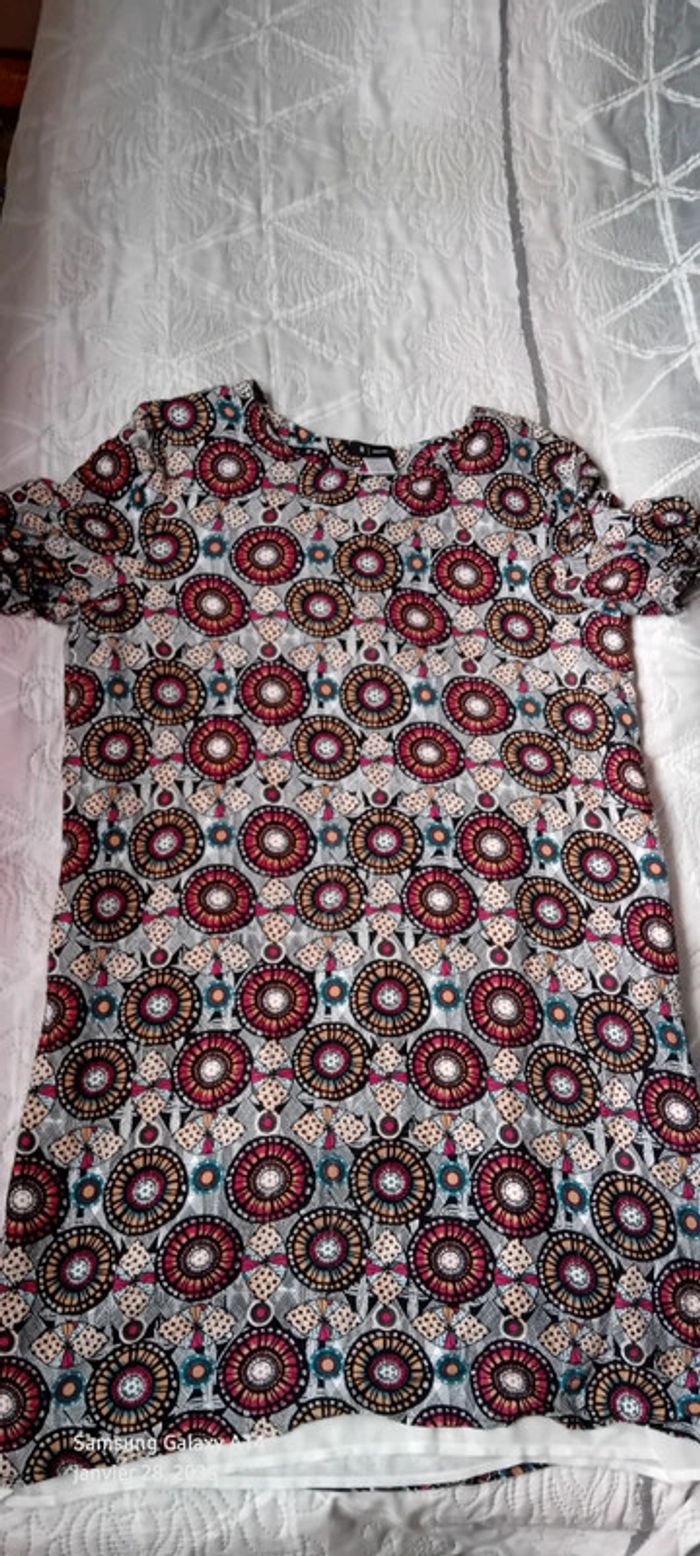 Robe coupe droite en viscose doublure polyester manches courtes col rond motif azteque ethnique coloré multicolore idéale pour les beaux jours longueur 85 cm largeur 51 cm largeur épaules 42cm longueur manches 23 cm très peu portée en très bon état #midole #midolefemme #midolefemme40 #robefemme40 #robemotifethnique40 #motifethnique #robecoloree40 #robemulticolore #laredoute #femme #motifazteque
