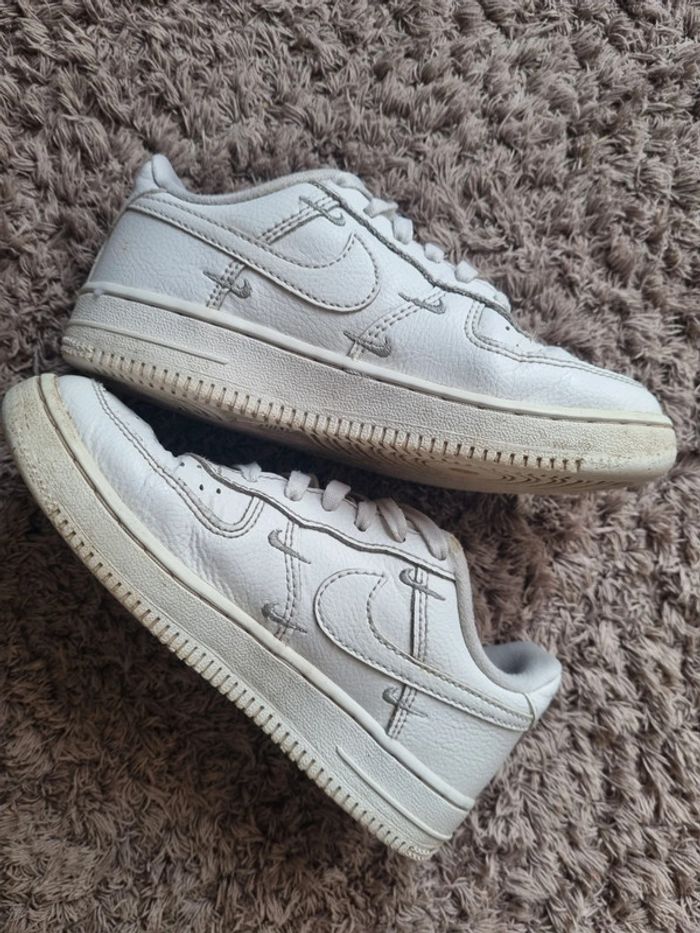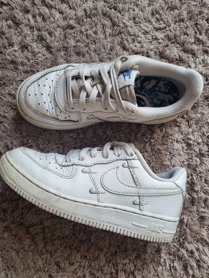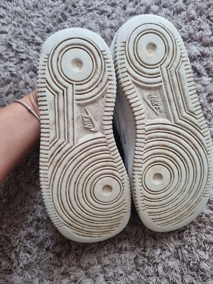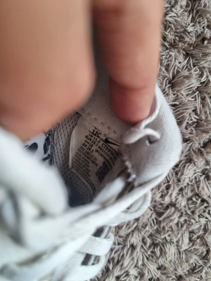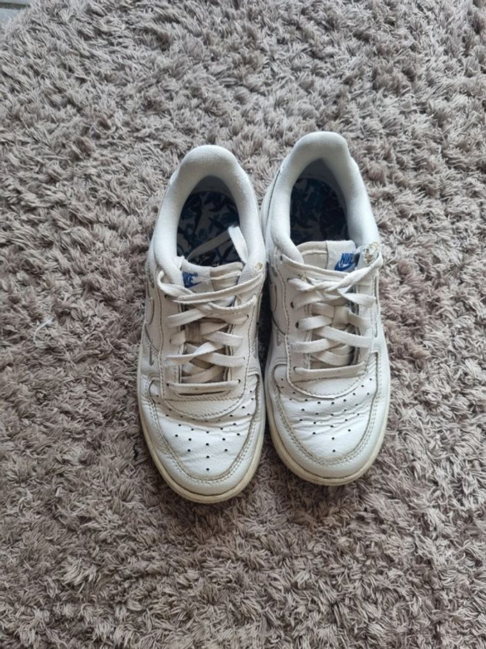 Pointure 29.5 Blanche détails gris Bon état général Juste l'usure en haut des lacets avec les pantalons, ne gêne en rien le confort