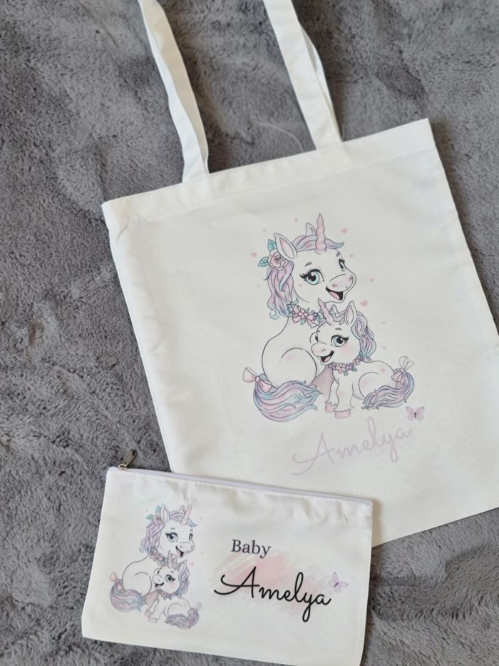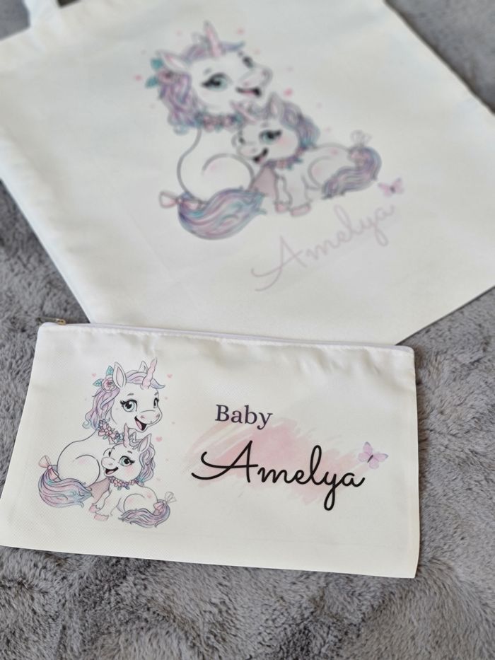 Ensemble trousse et sac imprimé Motif texte prénom logo dessin au choix
