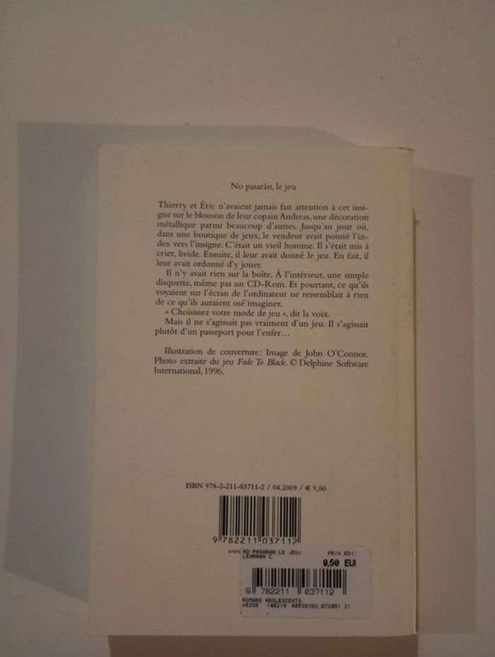 Éric et Thierry n’avaient jamais prêté attention à cet insigne sur la veste en cuir de leur copain Andreas. Une vieille décoration militaire parmi beaucoup d’autres. Jusqu’au jour où, dans une boutique de jeux vidéo à Londres, le vendeur, un vieil homme, avait pointé l’index vers l’insigne. Il était devenu livide, s’était mis à crier. Puis il leur avait donné le jeu, leur avait ordonné d’y jouer. – « Choisissez votre mode de jeu », avait demandé la voix. L’Expérience ultime n’est pas seulement un jeu vidéo, mais plutôt un passeport vers l’enfer, qui les renvoie dans le passé, sur le Chemin des Dames en 1917, à Guernica sous les bombes en 1937 ou à Paris pendant les rafles de juillet 1942… Editeur : Ecole des Loisirs 233 pages Dimensions : 19 x 13 cm Âge : + 12 ans Livre en parfait état Je vends d'autres livres de l'école des loisirs #phil_peg_écoledesloisirs #écoledesloisirs #dictature #guerre #jeuxderôles #violence #jeuxvidéo #fantastique