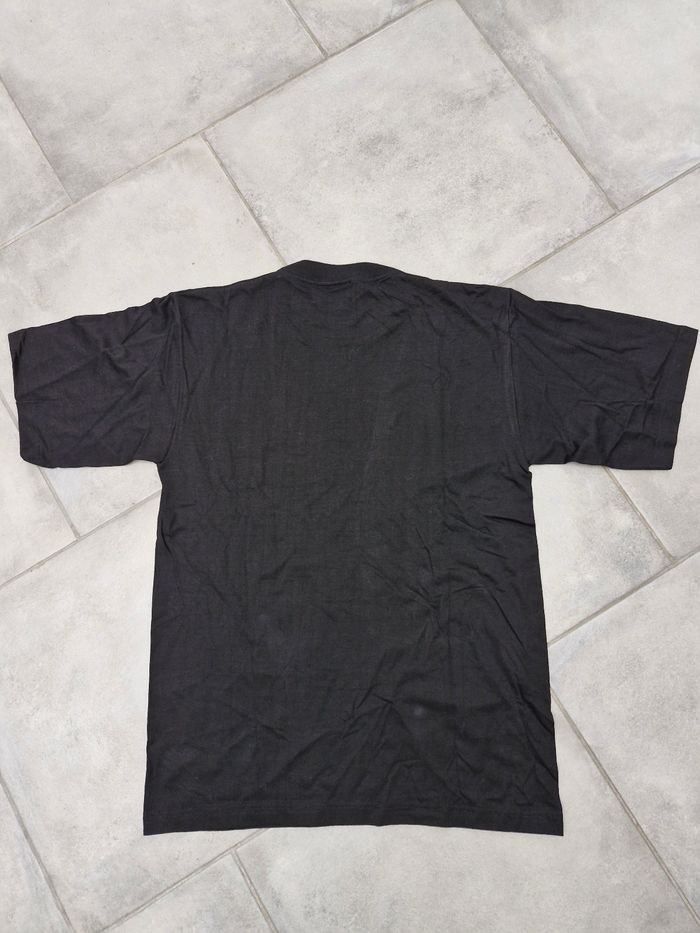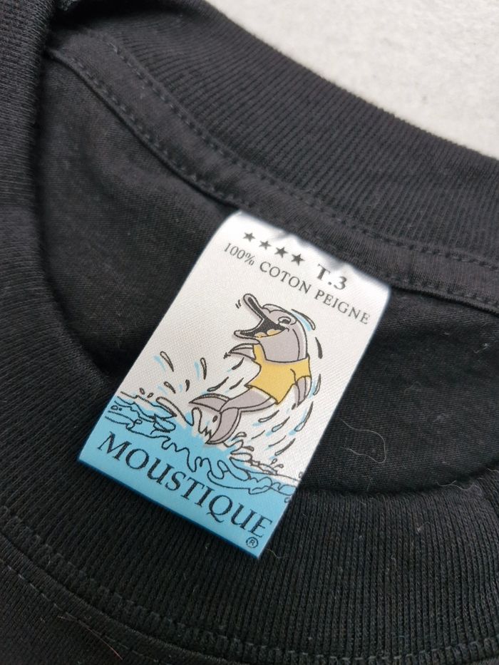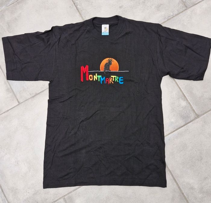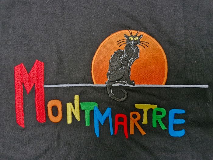 Thème Le chat noir de Montmartre. Motif multicolore qui ressort bien sur le noir du t-shirt. Taille 3. 100% coton. Quelques marques blanches visibles sur les photos. Aucun trou.