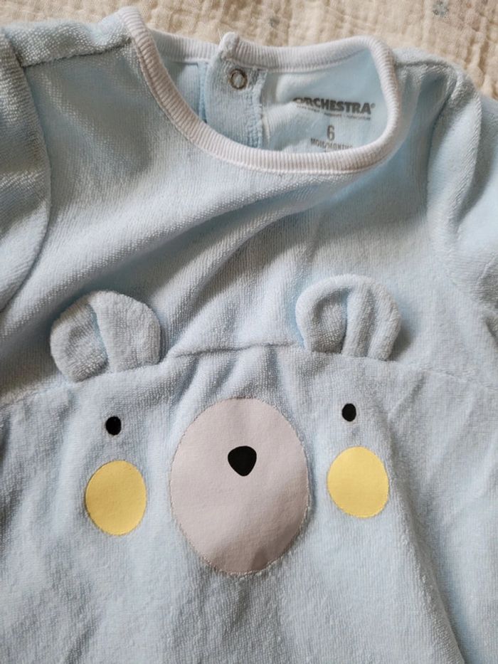 2 barboteuses de la marque Orchestra assorties. Taille 6 mois, 67 cm. Sans manches, combicourte, thème d'ourson. La bleu ciel, est en tissu éponge, motif d'ourson sur le devant et oreilles. Élastique au niveau des cuisses. Elle s'ouvre grâce à des boutons pressions sur l'arrière et à l'entrejambe pour le change. La blanche est en coton, légère, motifs divers. Elle s'ouvre grâce à des boutons pressions sur l'arrière et à l'entrejambe pour le change. Achetées neuves en magasin été 2023. Portées par un seul bébé garçon. #T6_9mois_baptlily