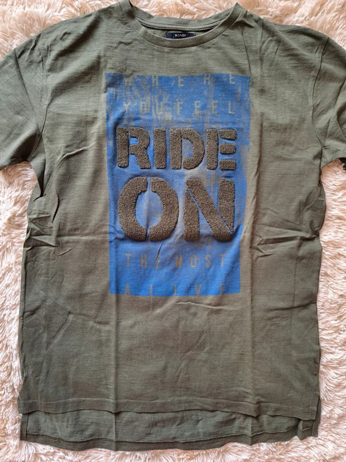 T-shirt vert, kaki et bleu avec écriture, pour un look dynamique et coloré 🌿💙 - photo numéro 1