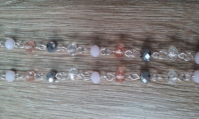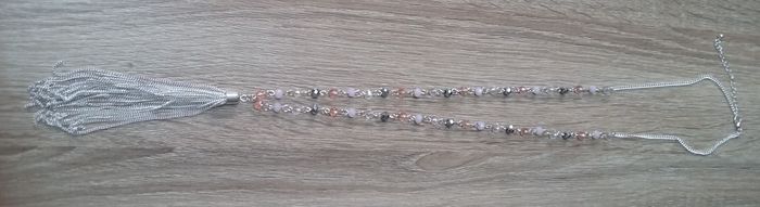 Joli sautoir argenté aux 4 perles : transparentes, 2 roses et grises.