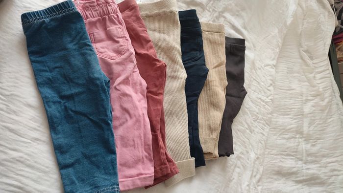 Lot de pantalons taille 12 mois. En toute honnêteté, le dernier est affiché 12 mois mais taille plus comme un 9 mois. Différentes coloris En bon état Différentes marques : Tao, Zeeman, Kiabi #pantalonbebefille12mois