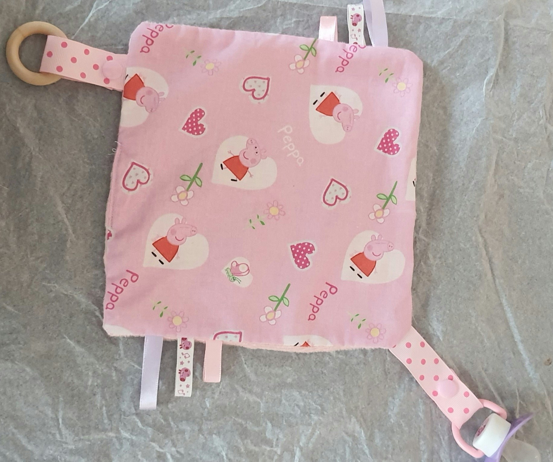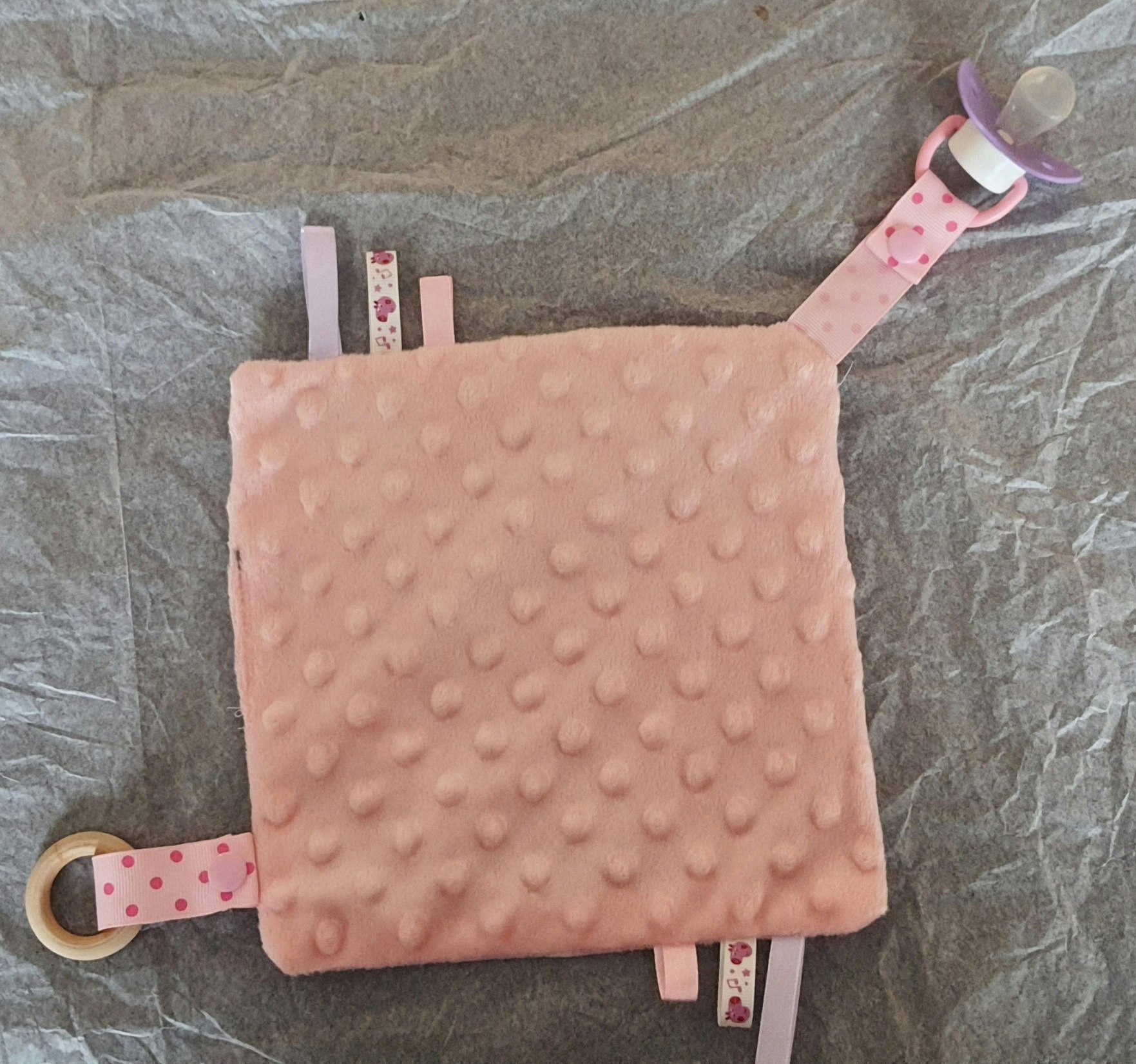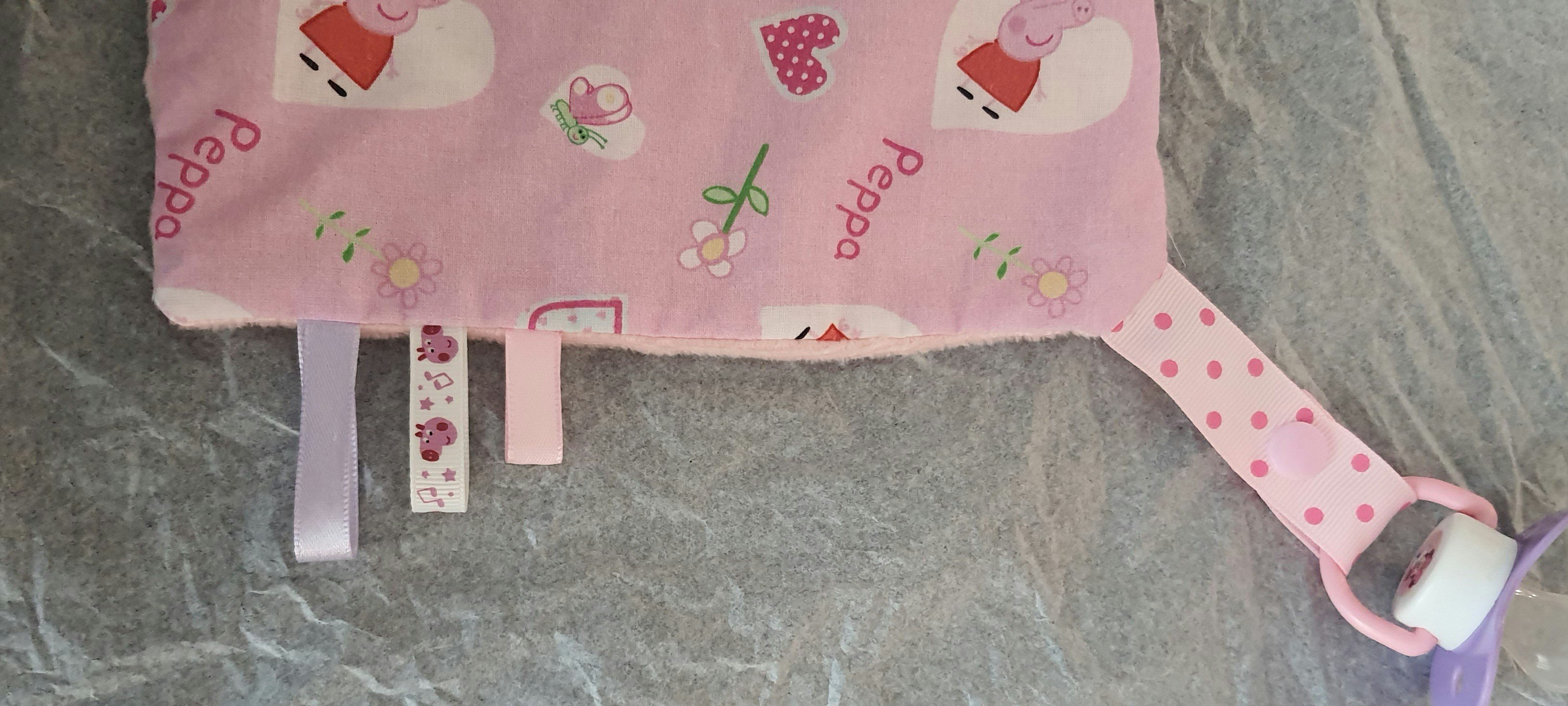Bonjour Je vends un doudou avec attache sucette et anneau de dentition. Une face en coton et une autre en Minky, tout doux... Fait main.