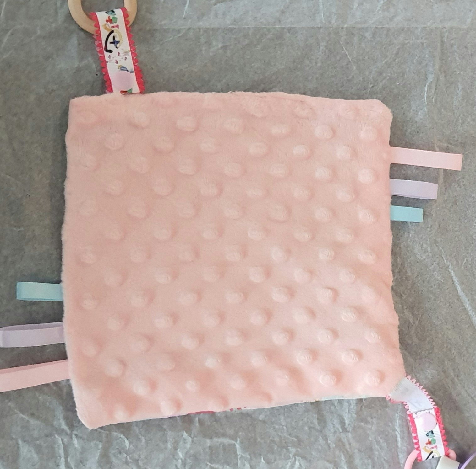 Bonjour Je vends un doudou avec attache sucette et anneau de dentition. Une face en coton et une autre en Minky, tout doux... Fait main.d