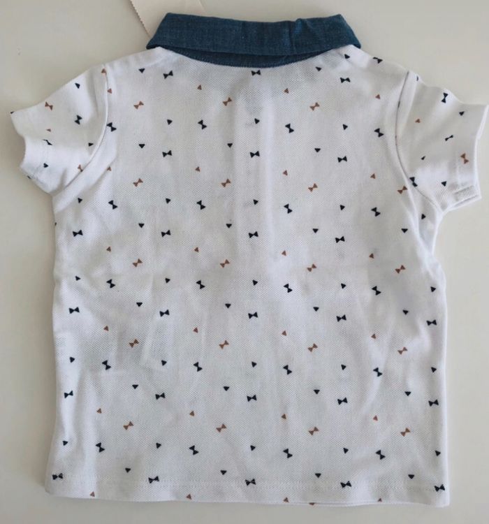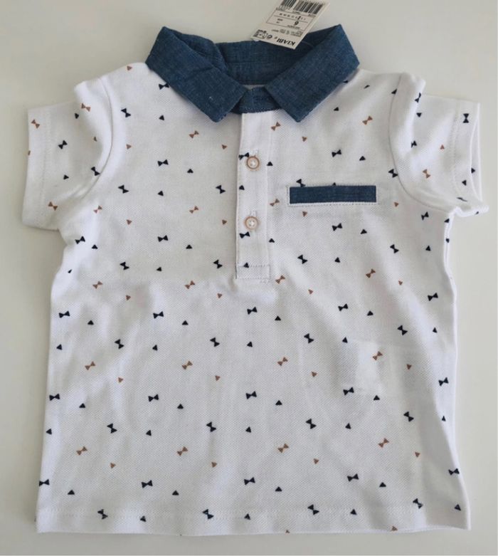 Je vends un polo blanc, bleu et beige, neuf. Taille 6 mois.