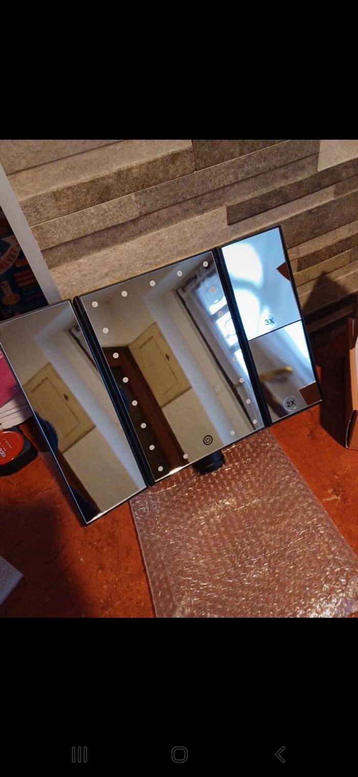 Miroir pour se maquiller , dispose 21 lumières LED, la lumière peut être ajustée. Conception en trois volets. Double alimentation : piles non fournies ou câble USB. Neuf, encore emballé. Sorti juste pour les photos