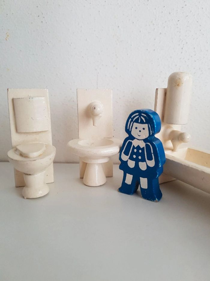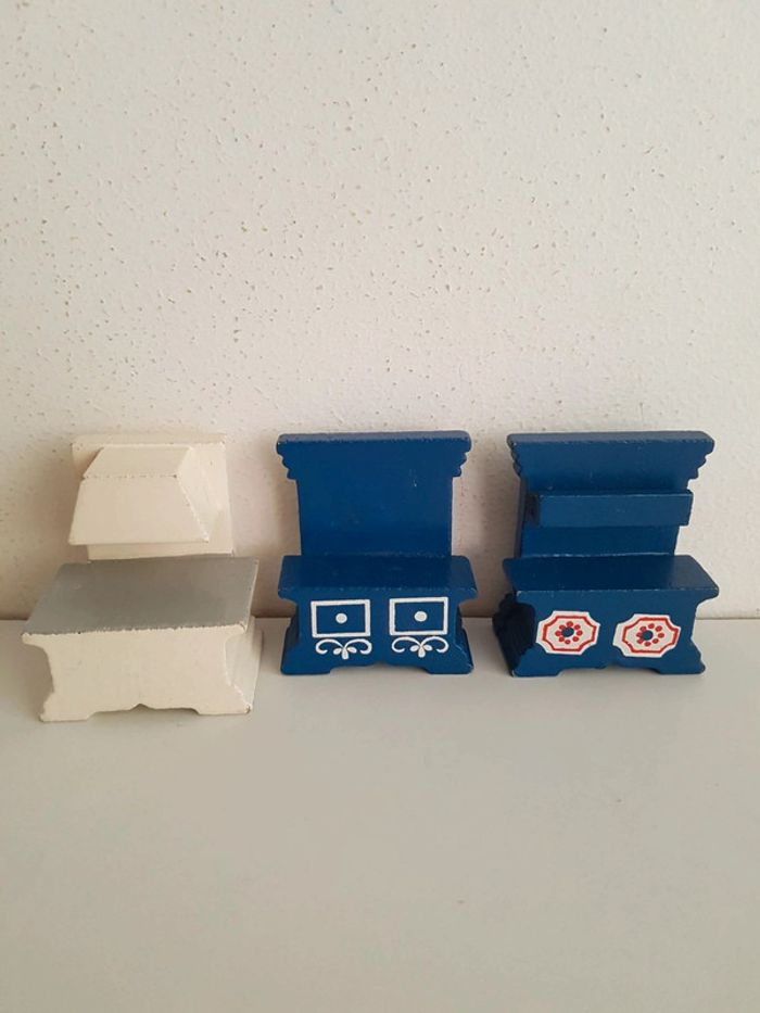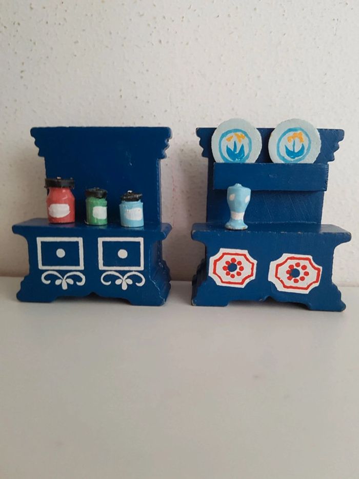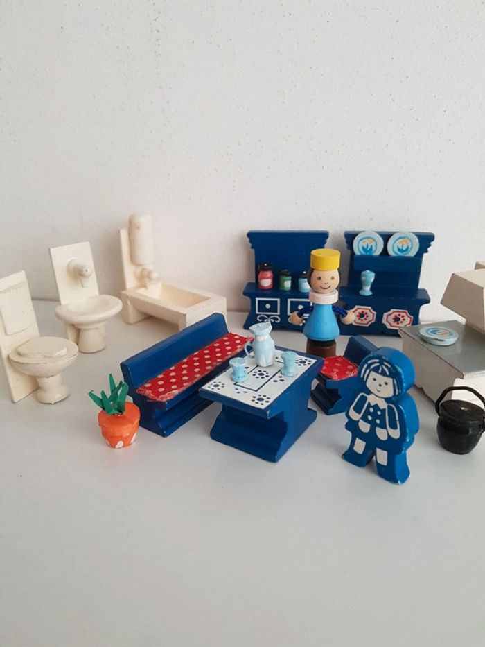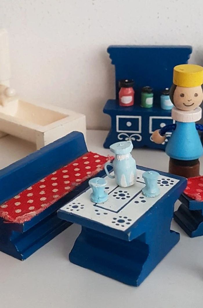 Lot de meubles miniatures en bois pour aménager une petite maison de poupée Mobilier complet pour cuisine, salon et salle de bain : cuisinière, vaisselier, comptoir, table, banc et chaise, baignoire, WC et lavabo 2 petites figurines : fille bleue et reine Hauteur des meubles bleus  : 5 cm Hauteur du personnage bleu : 4,2 cm Hauteur de la table : 2,3 cm 12 petits accessoires : marmite, plante dans pot, carafe, assiette, verre, pots Hauteur du pot vert : 1 cm Hauteur de la carafe : 1,5 cm