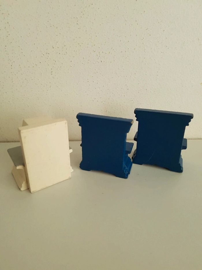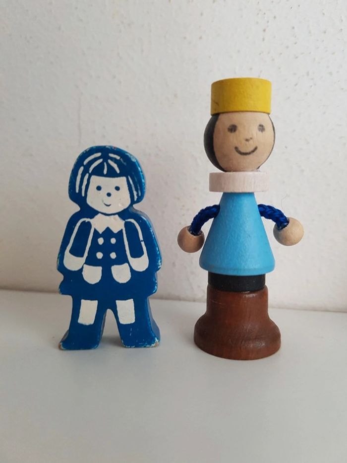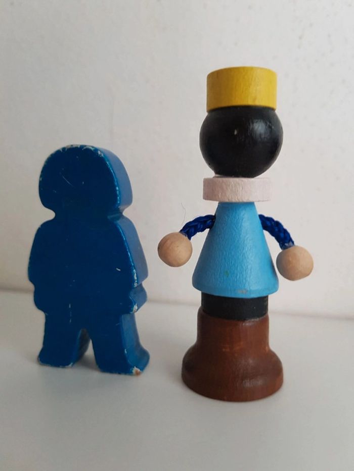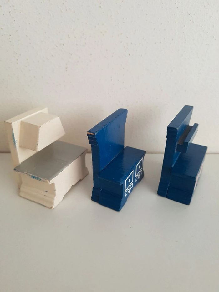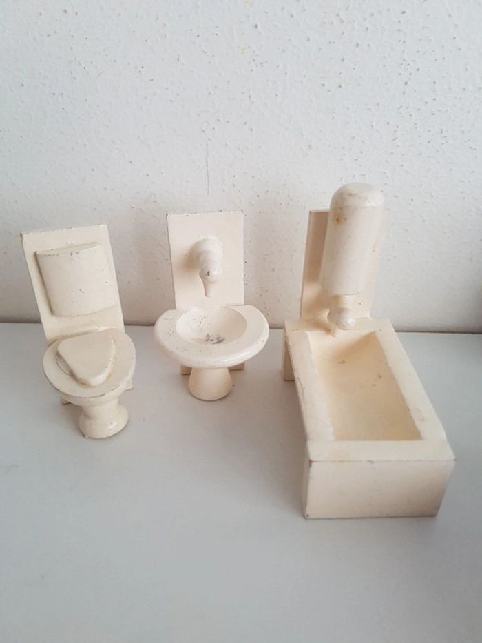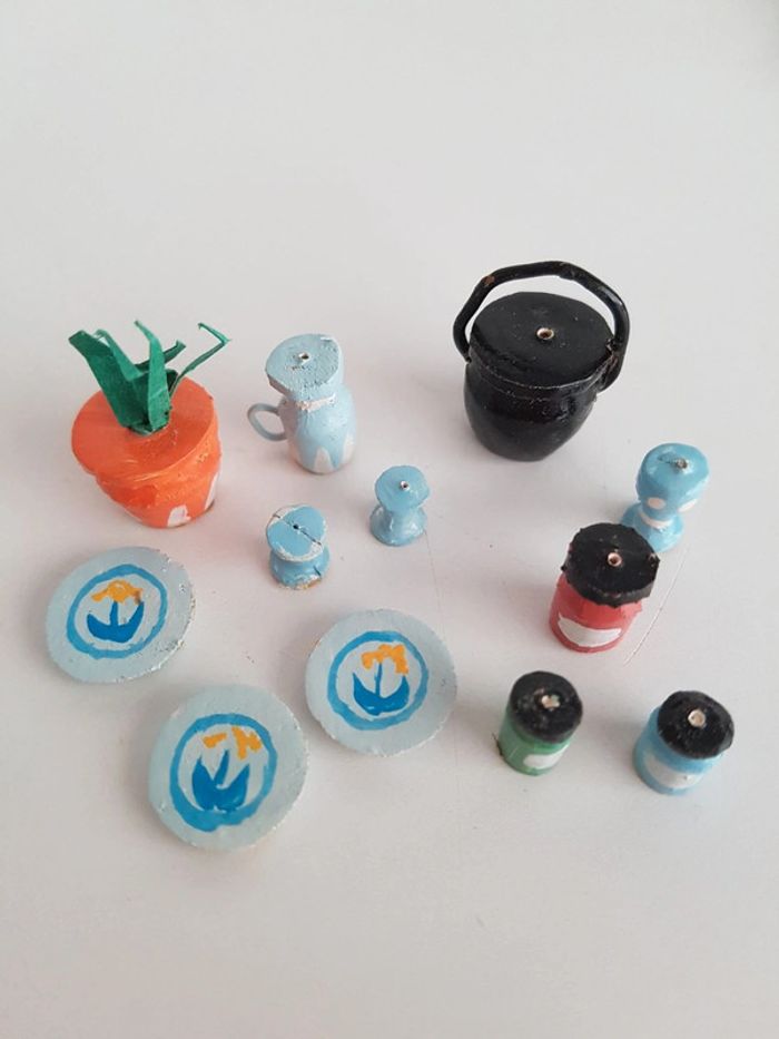 Lot de meubles miniatures en bois pour aménager une petite maison de poupée Mobilier complet pour cuisine, salon et salle de bain : cuisinière, vaisselier, comptoir, table, banc et chaise, baignoire, WC et lavabo 2 petites figurines : fille bleue et reine Hauteur des meubles bleus  : 5 cm Hauteur du personnage bleu : 4,2 cm Hauteur de la table : 2,3 cm 12 petits accessoires : marmite, plante dans pot, carafe, assiette, verre, pots Hauteur du pot vert : 1 cm Hauteur de la carafe : 1,5 cm