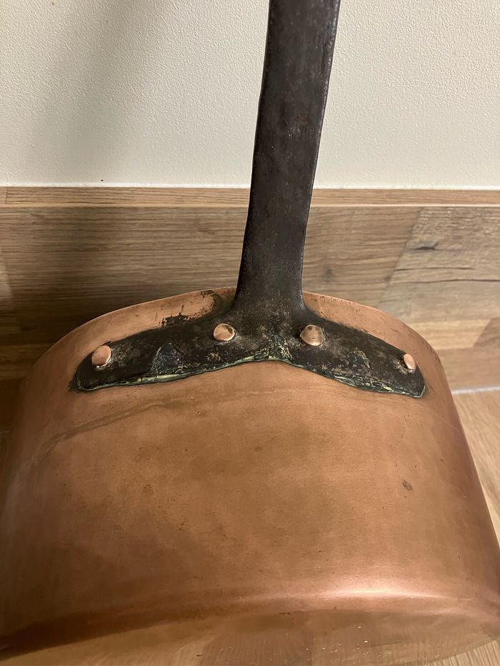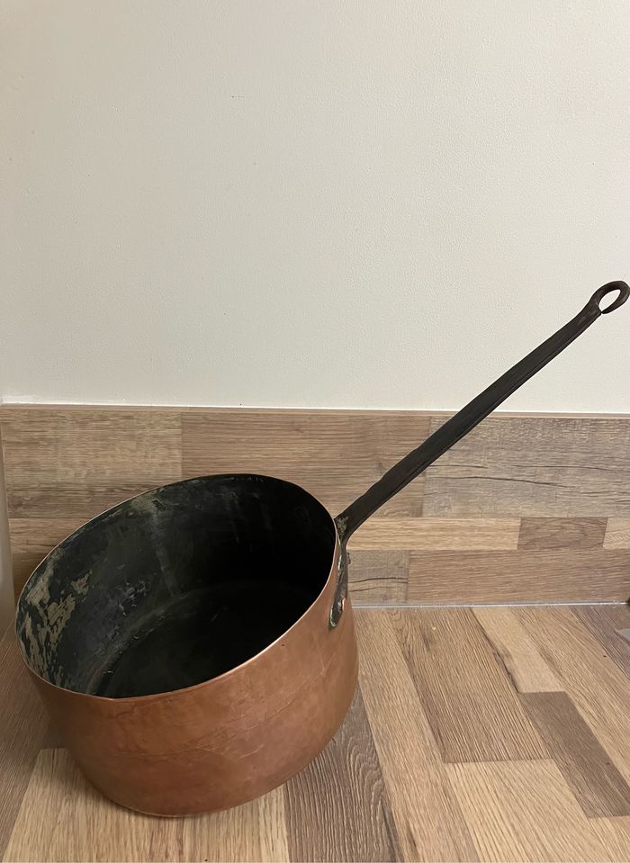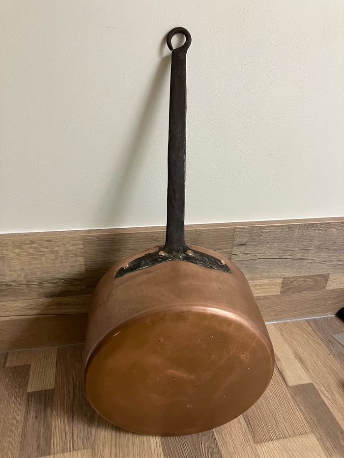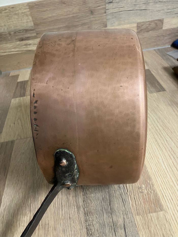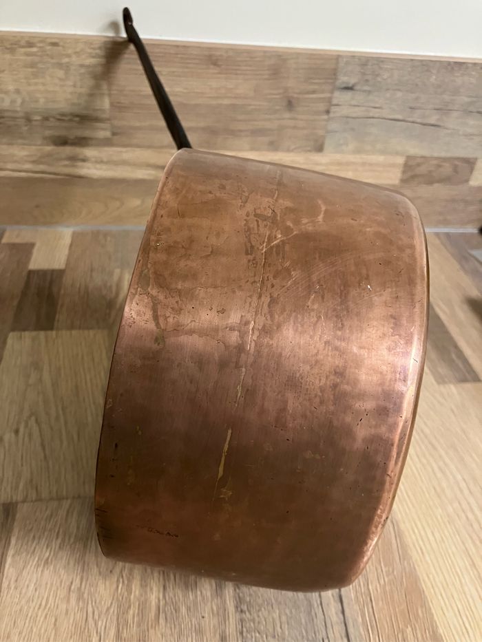 Cette casserole en cuivre est ancienne. Elle est en bon état pour l’époque : seul l’intérieur porte vraiment les traces du temps avec des taches (voir photos) mais cela ne nuit pas à son esthétique. Bel élément de décoration ou de collection pour les amateurs Dimensions : - diamètre : 22 cm - hauteur : 11,5 cm Longueur de la queue : 26,5 cm