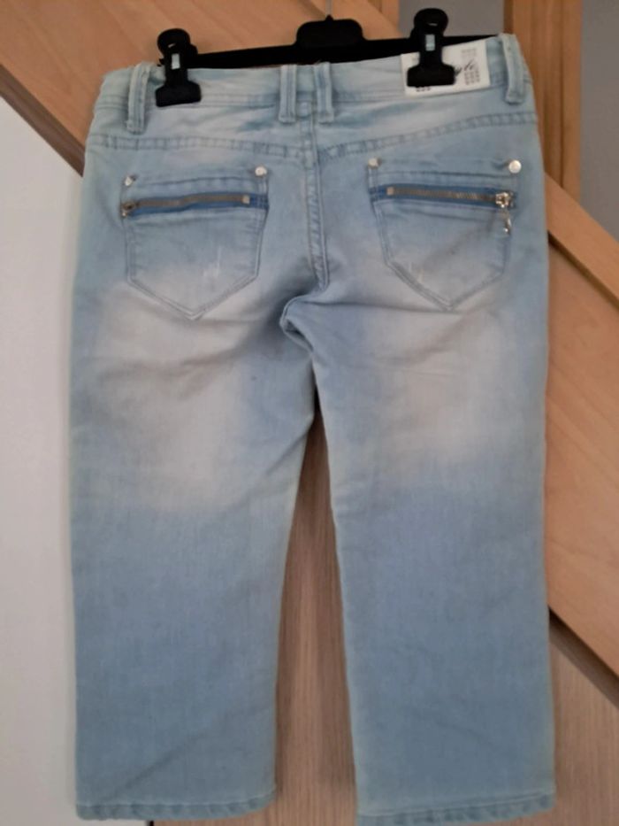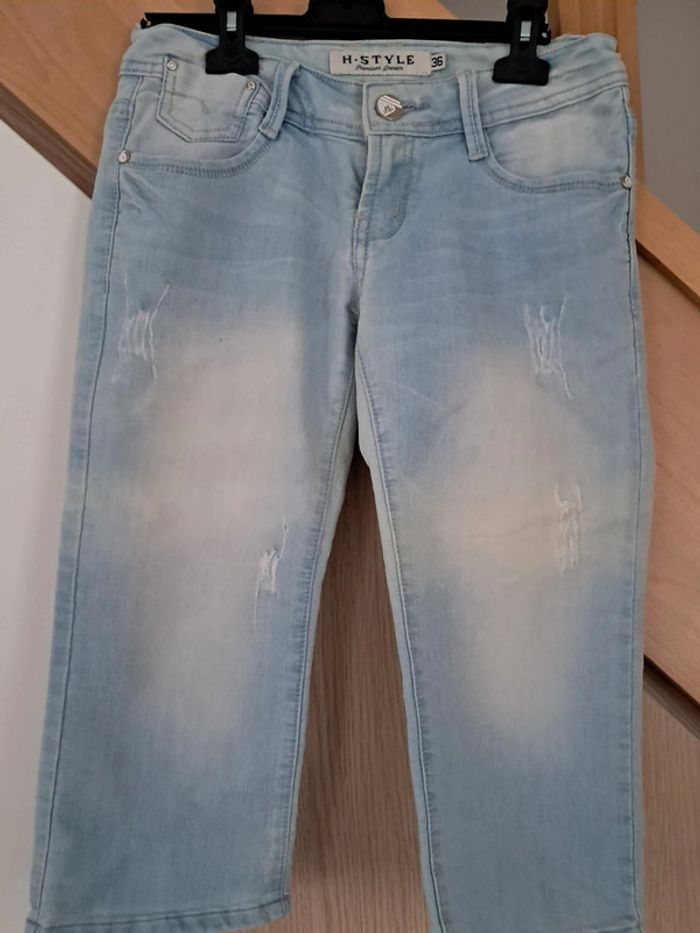 Pantacourt en jean, avec des déchirures qui decorent le jean. Taille 36, très bon état. Marque h.style jeans.