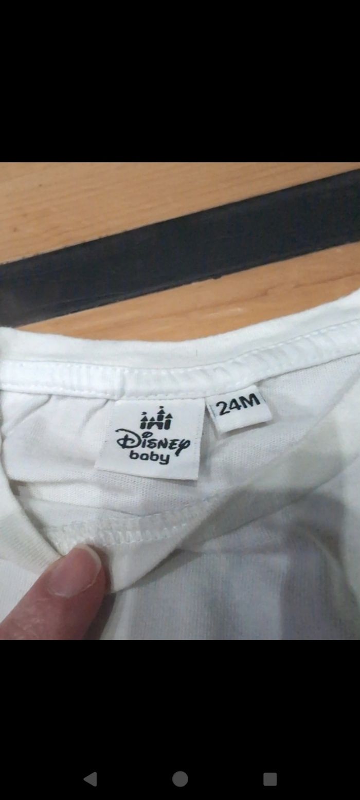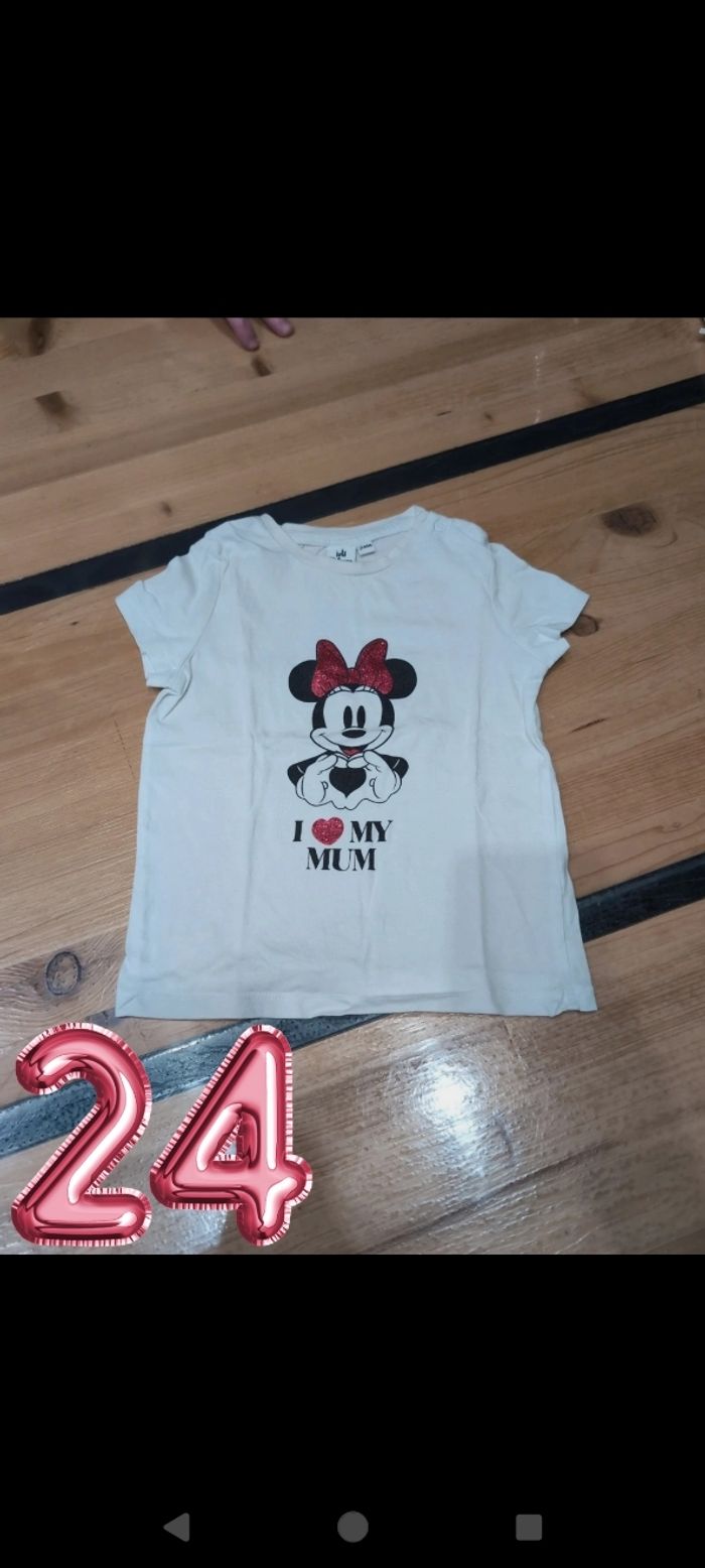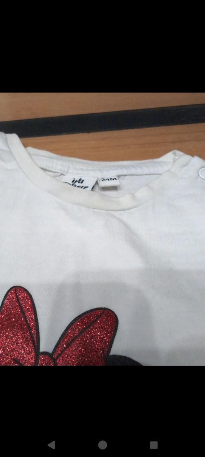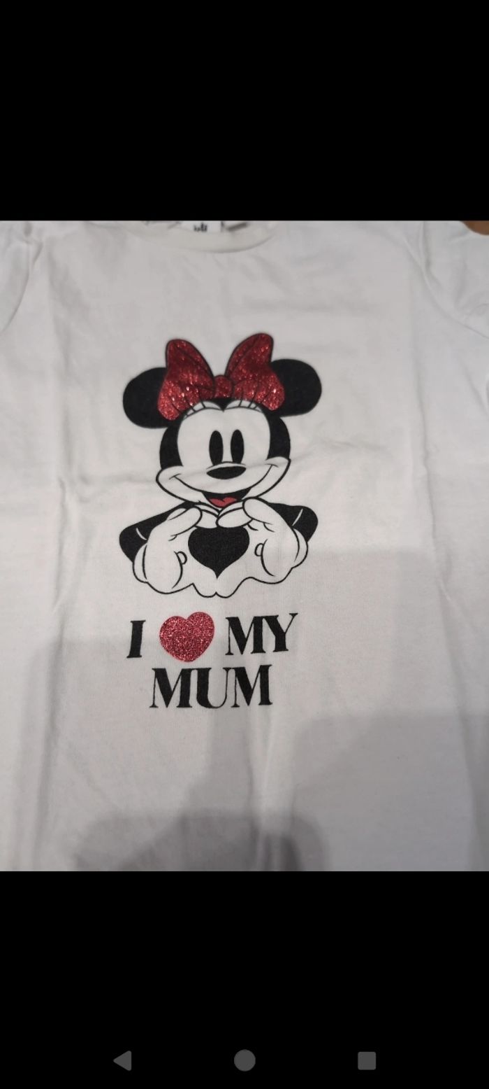 Motif Minnie à noeud pailleté rouge qui fait un coeur avec ses mains. Inscription "i ❤️ my mum". Fermeture par deux pressions à l'épaule gauche. Attention le col est légèrement jauni par de la crème solaire (cf. Photo)