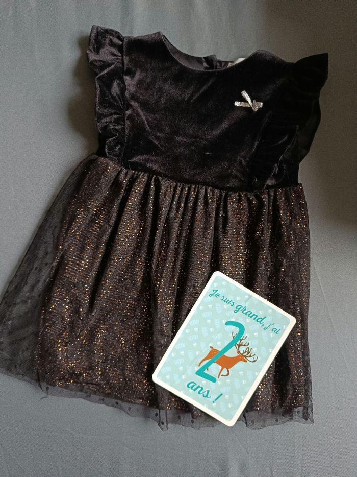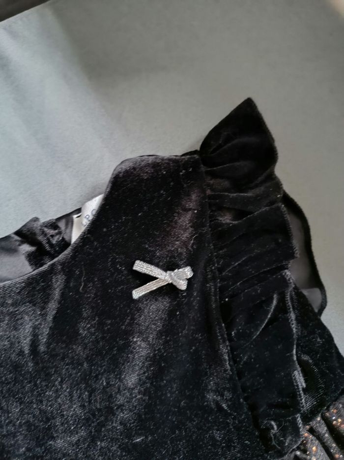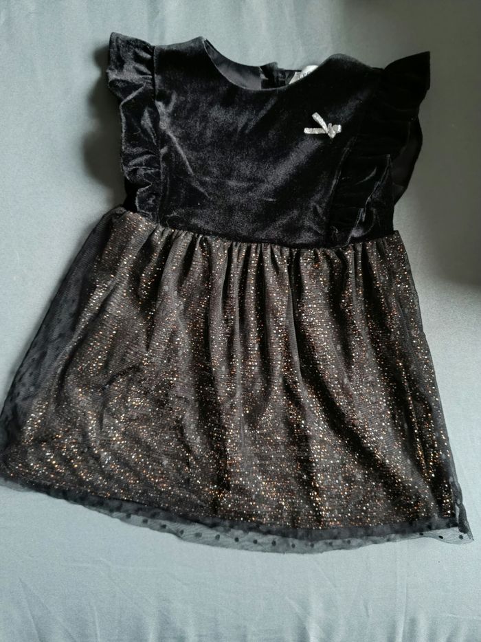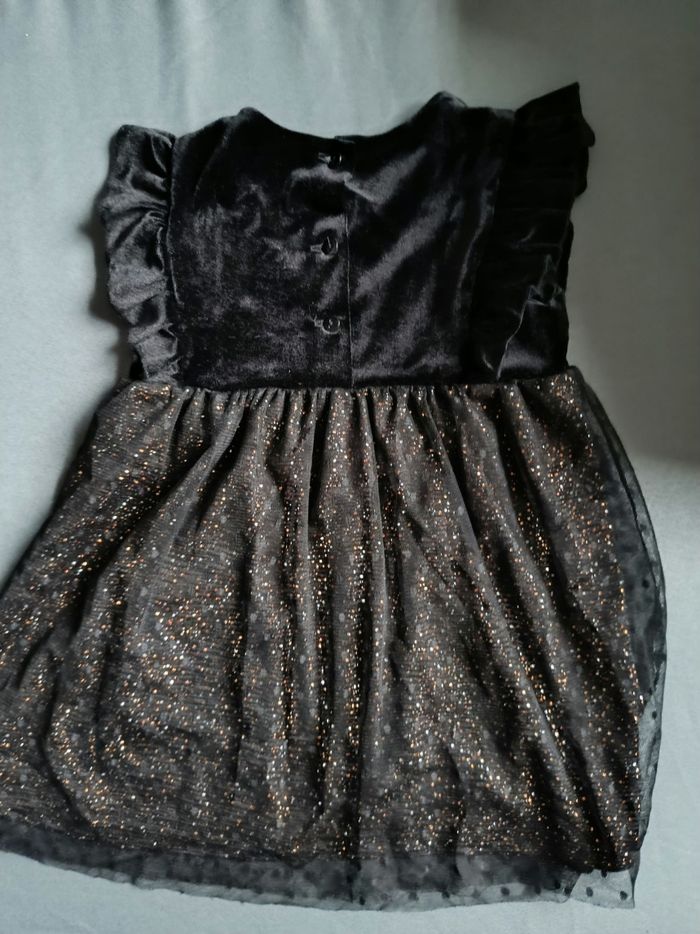 Robe noire de soirée haut noir en velours et bas brillant avec doublure coton. En très bon état. Taille 24 mois 💕Beaucoup de vêtements dans mon dressing avec réduction sur lot. Je fais le grand tri !