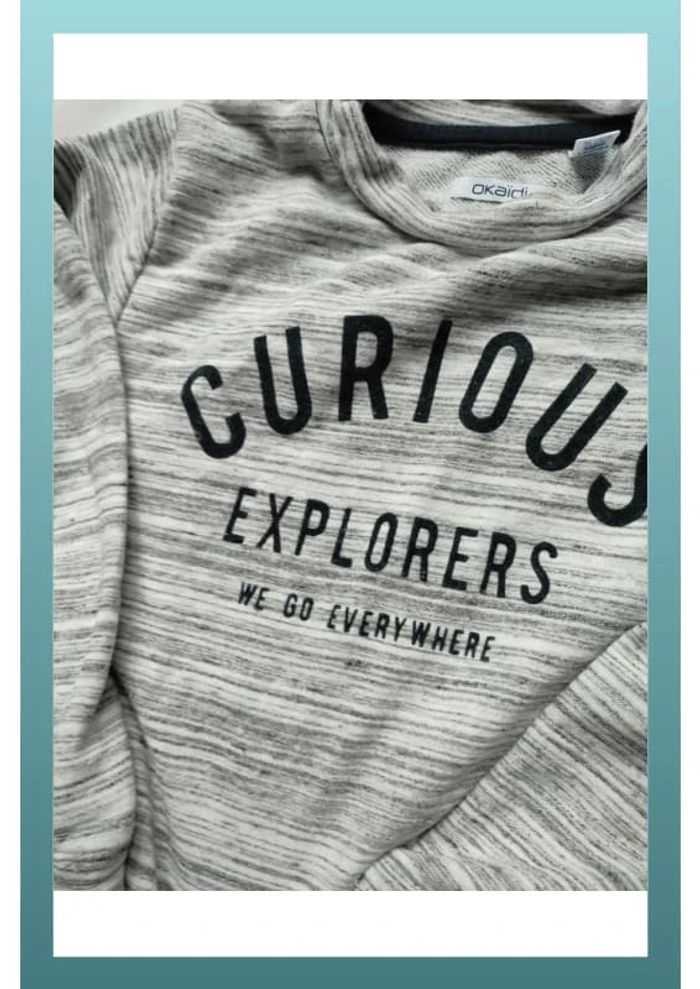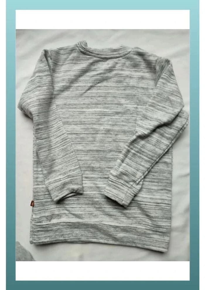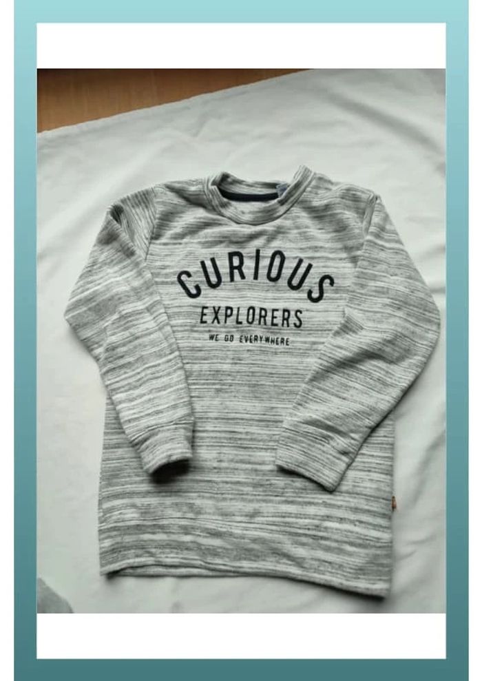 #iansologarçon8ans #iansologarçon9ans Pull tissu rayé et chiné . Taille grand Bon état pas de trou ni tâche juste porté "curious explorers we go everywhere" écrit dessus Coton et polyester