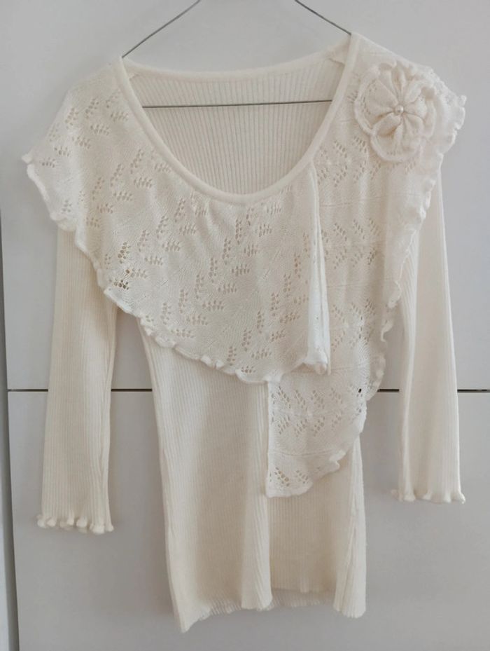 Pull vintage côtelé crème col dentelle - photo numéro 1