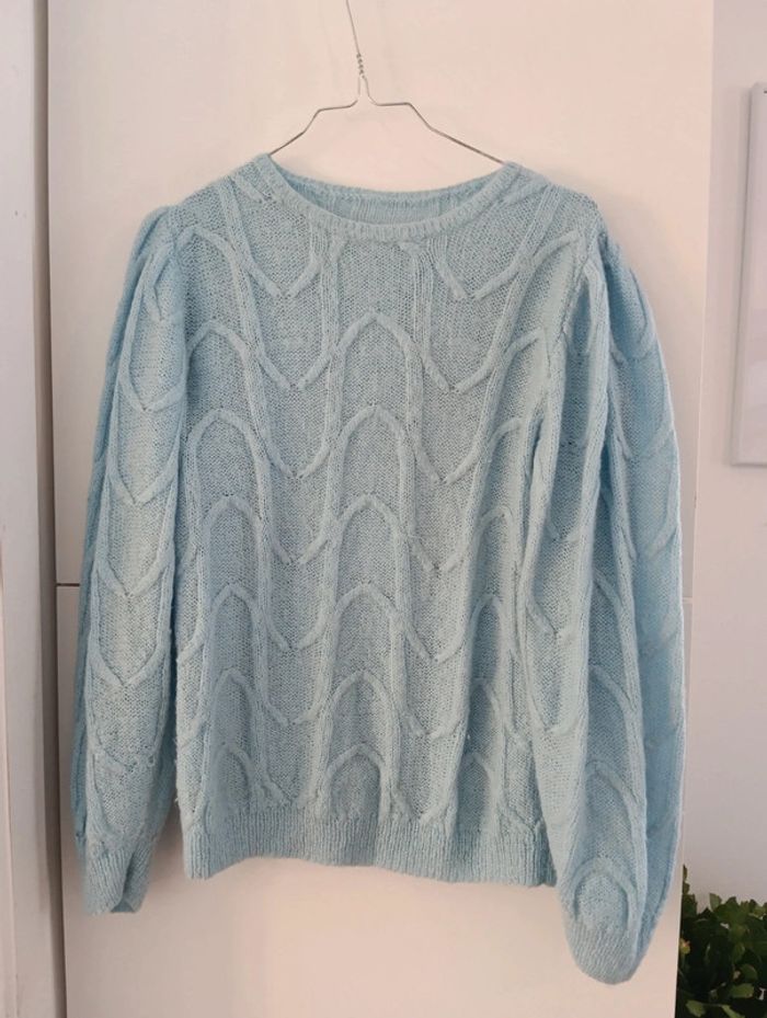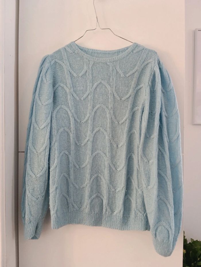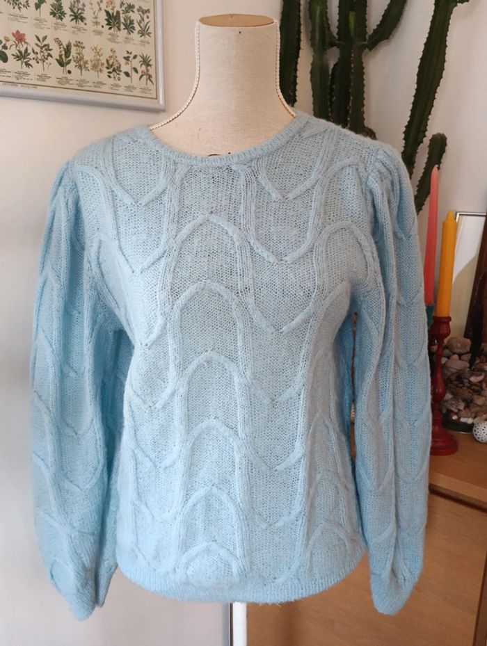 Pull léger bleu ciel handmade / fait main jolie maille Taille 40 estimée à confirmer avec les mesures Epaules 40cm Aisselles 54cm Longueur 62cm